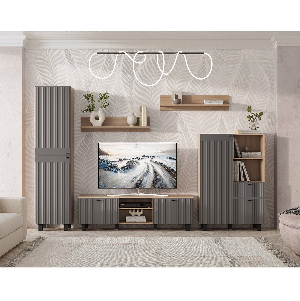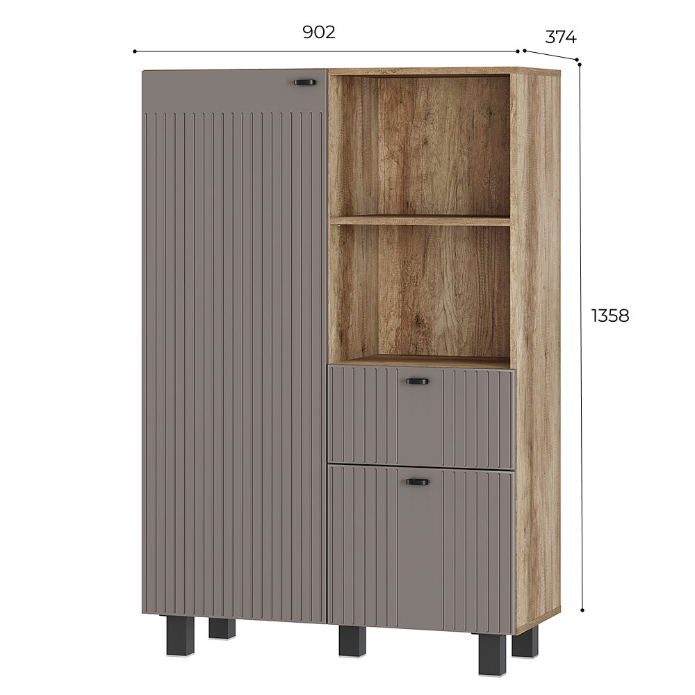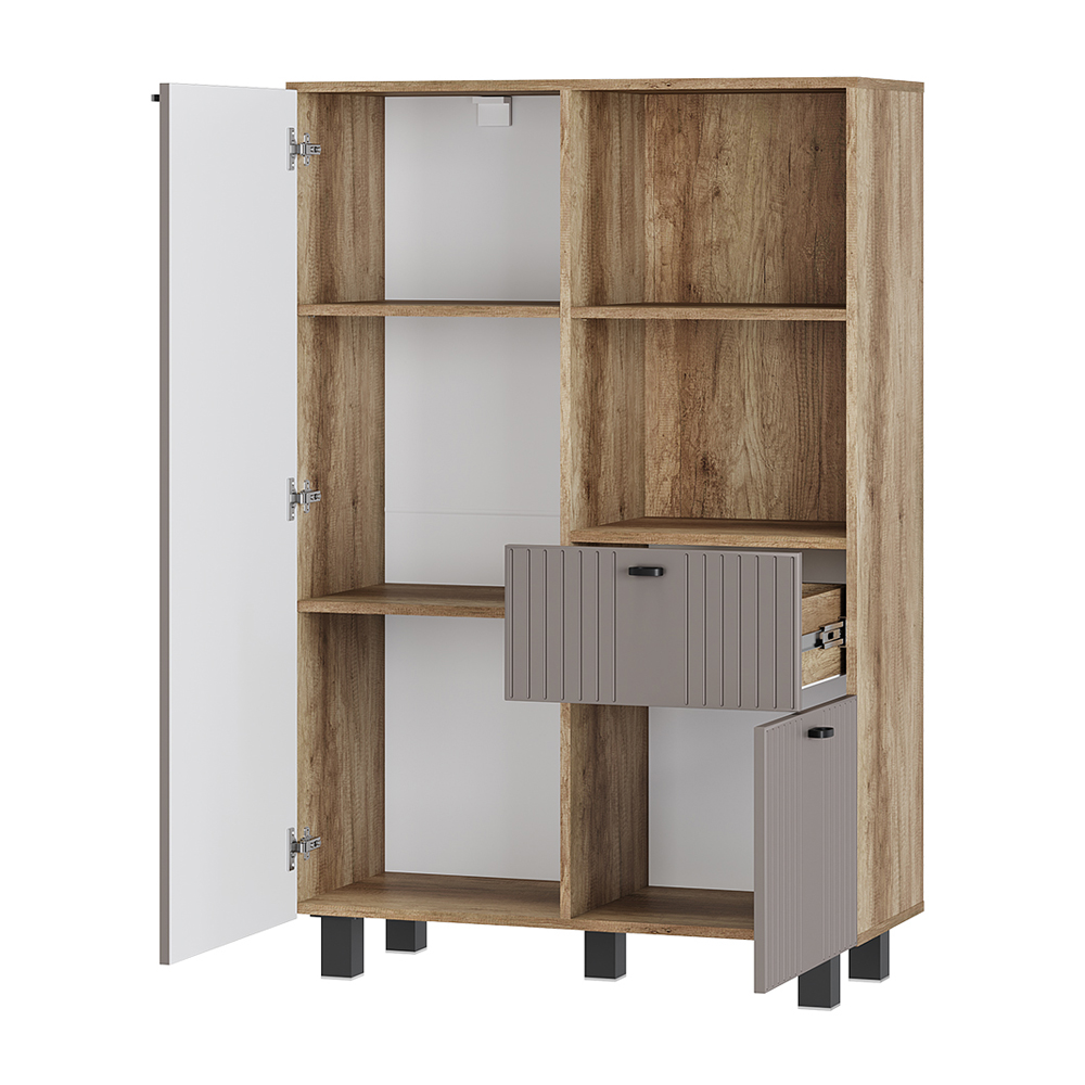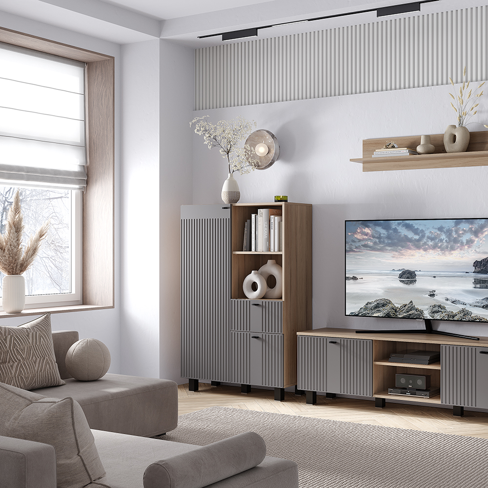 Комод Олива станет стильным дополнением интерьера и удобным решением для хранения вещей. Вертикальная фрезеровка на фасадах и корпус в древесной гамме придают модульной серии Олива особый шарм и индивидуальность. На открытых полках можно разместить декор, книги и сувениры, а за фасадами скрыть личные вещи. Комод имеет выдвижной ящик, с которым организовать хранение еще удобнее.