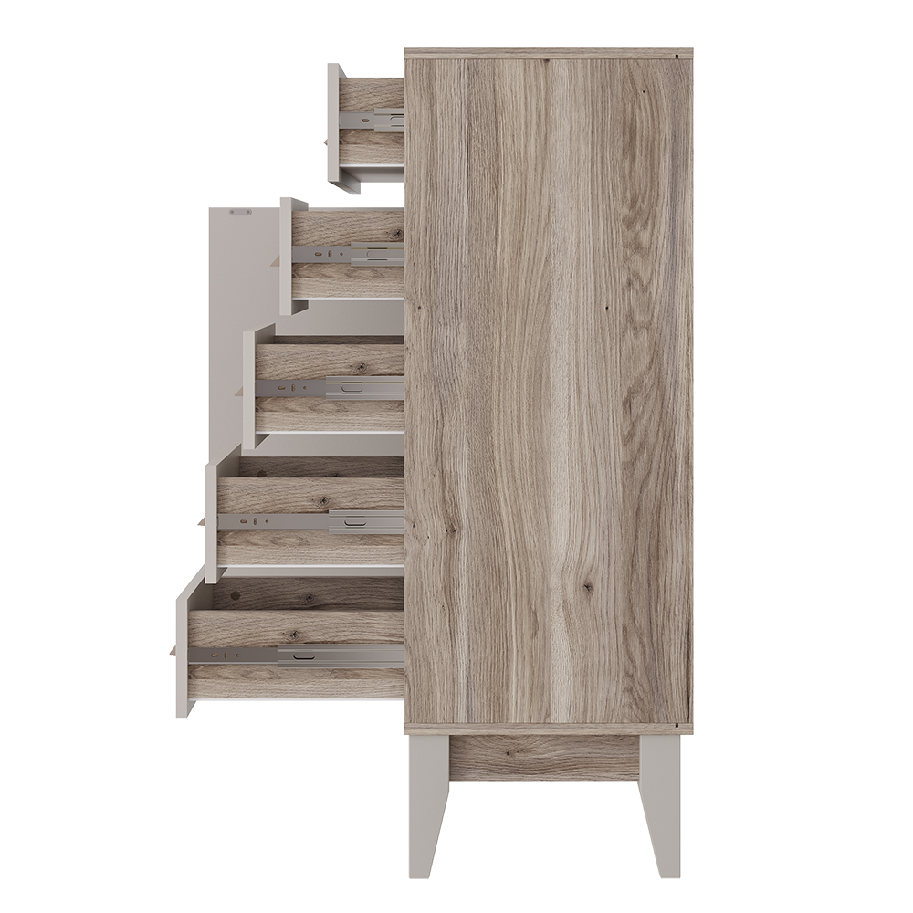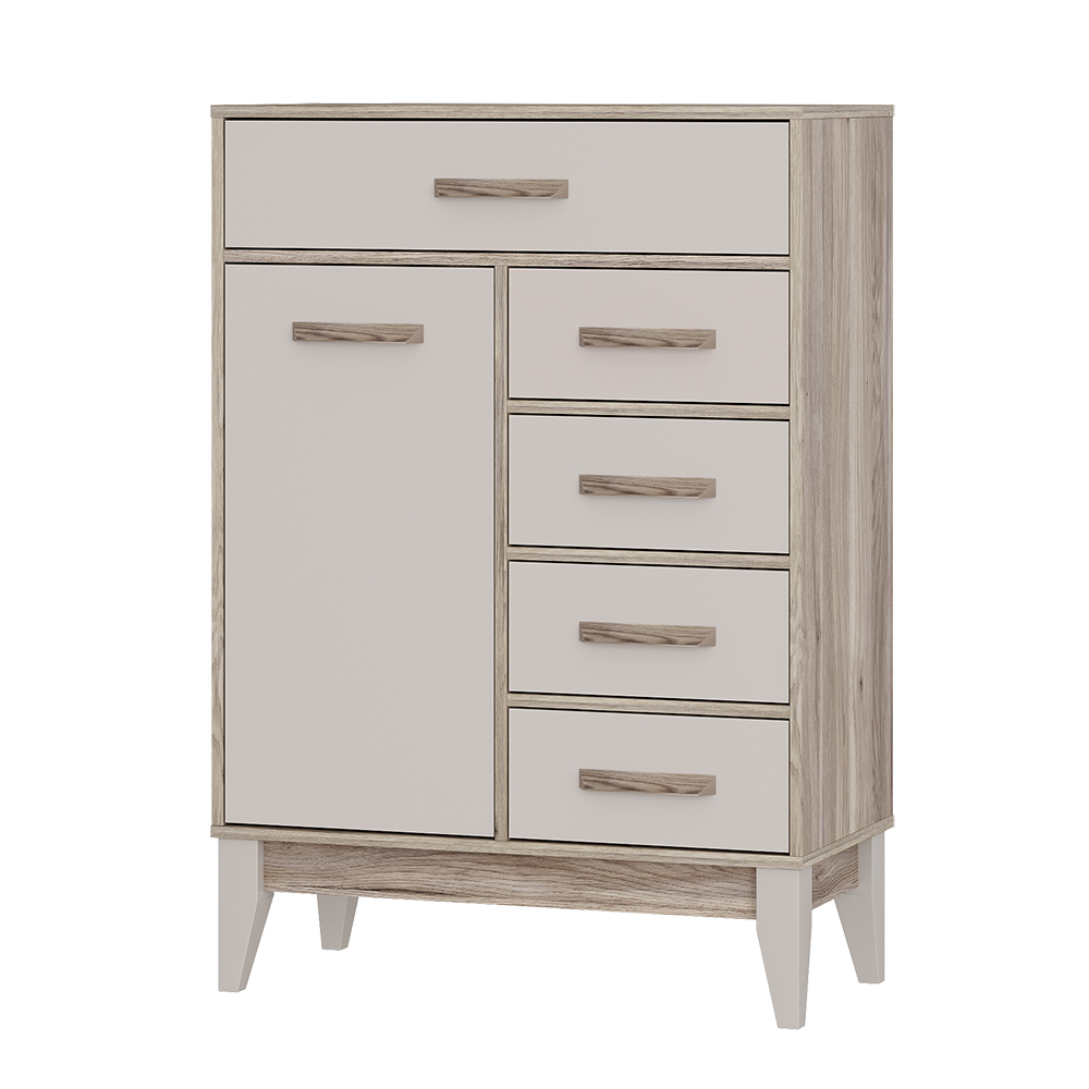 Компактный комод Скандика оснащён пятью выдвижными ящиками с плавным механизмом открытия и полкой за фасадом. Данный комод украсит вашу спальню, гостиную и даже детскую.