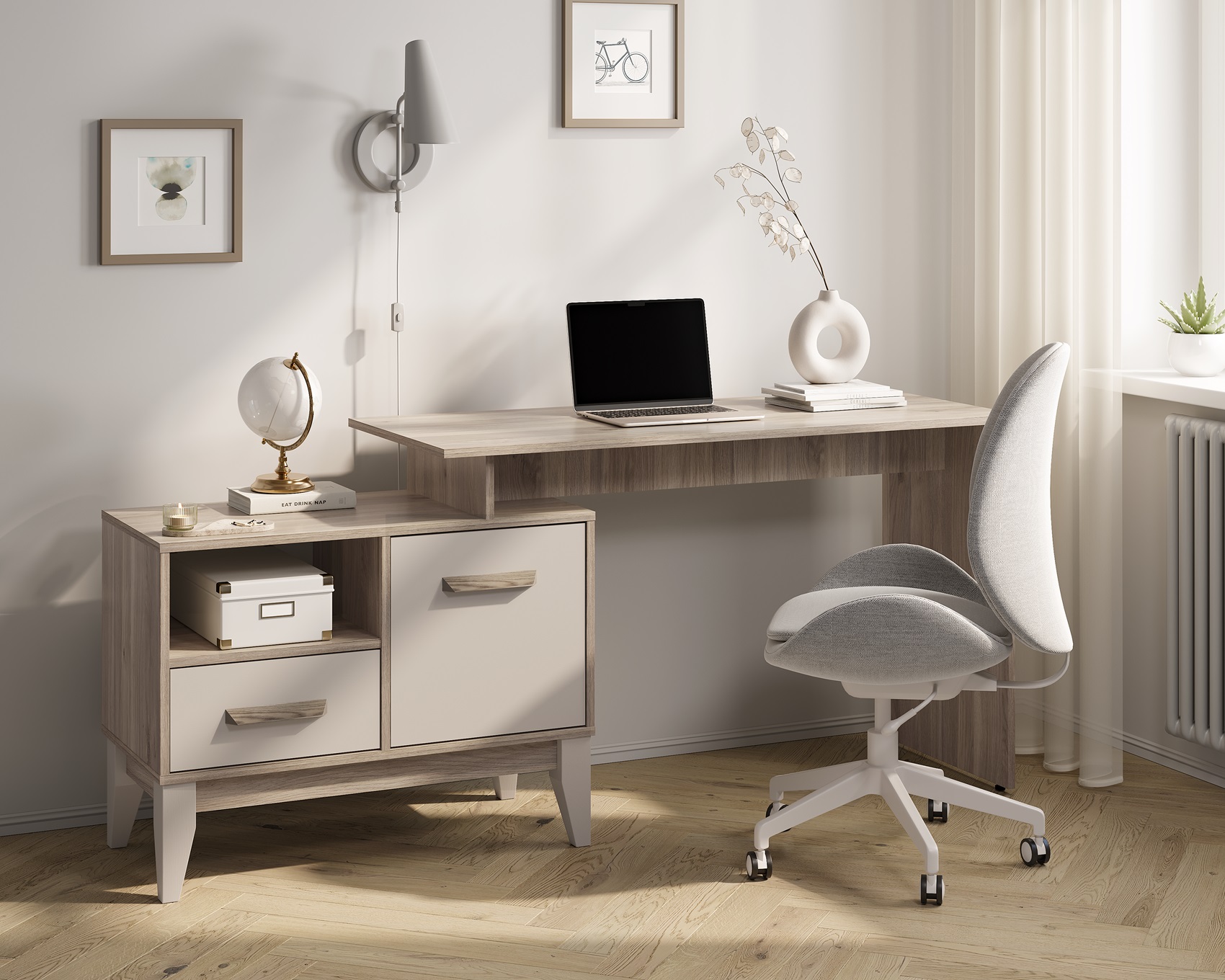 Письменный стол Скандика - это универсальное решение для дома или офиса. У данной модели удобная рабочая поверхность, встроенная тумба, которая состоит из просторного отсека за дверцей, ящика и одной открытой полки. Благодаря компактным размерам стол не занимает много места и подойдет для небольшой комнаты.