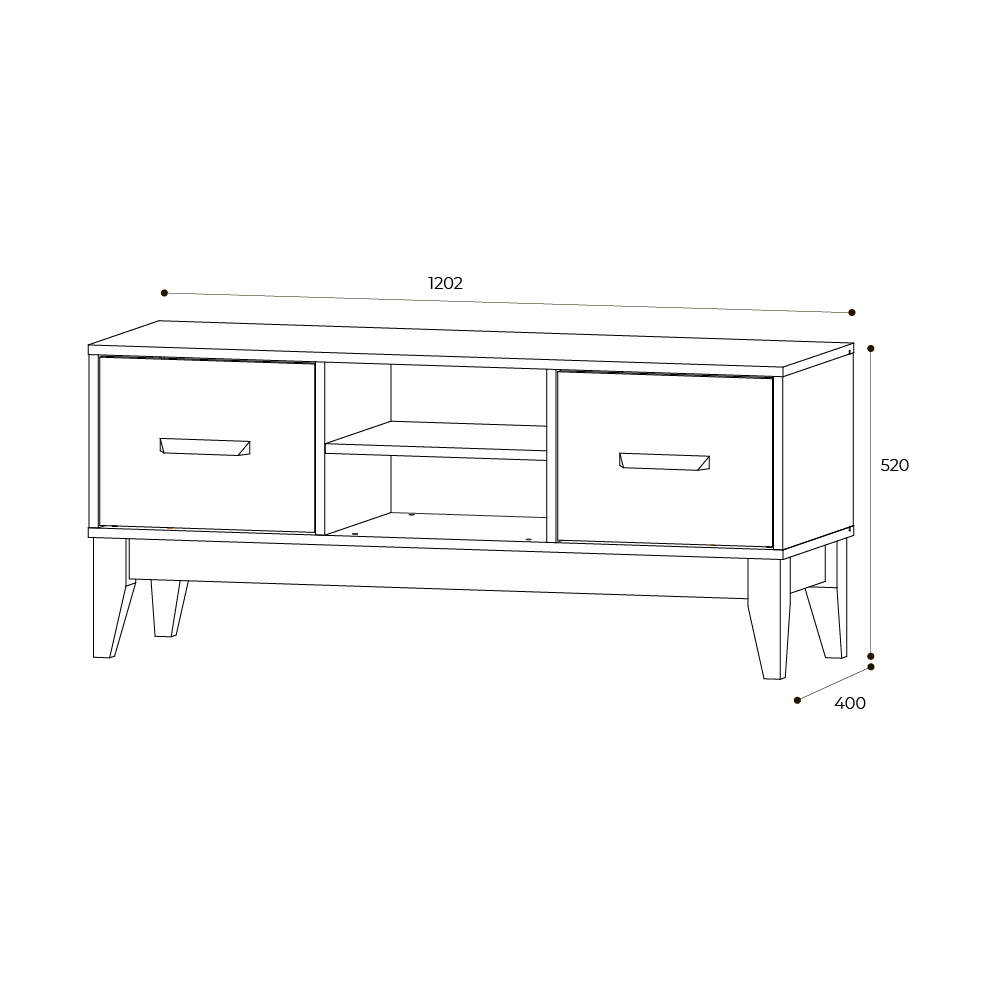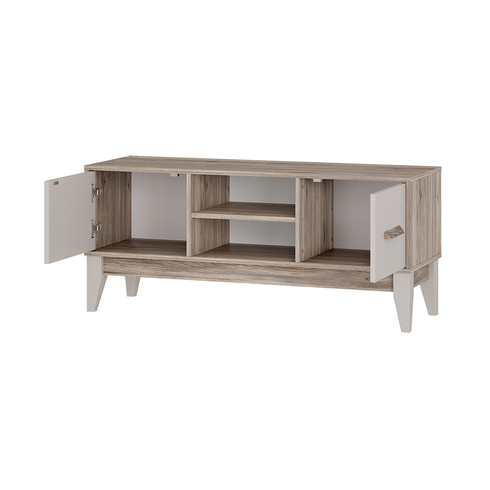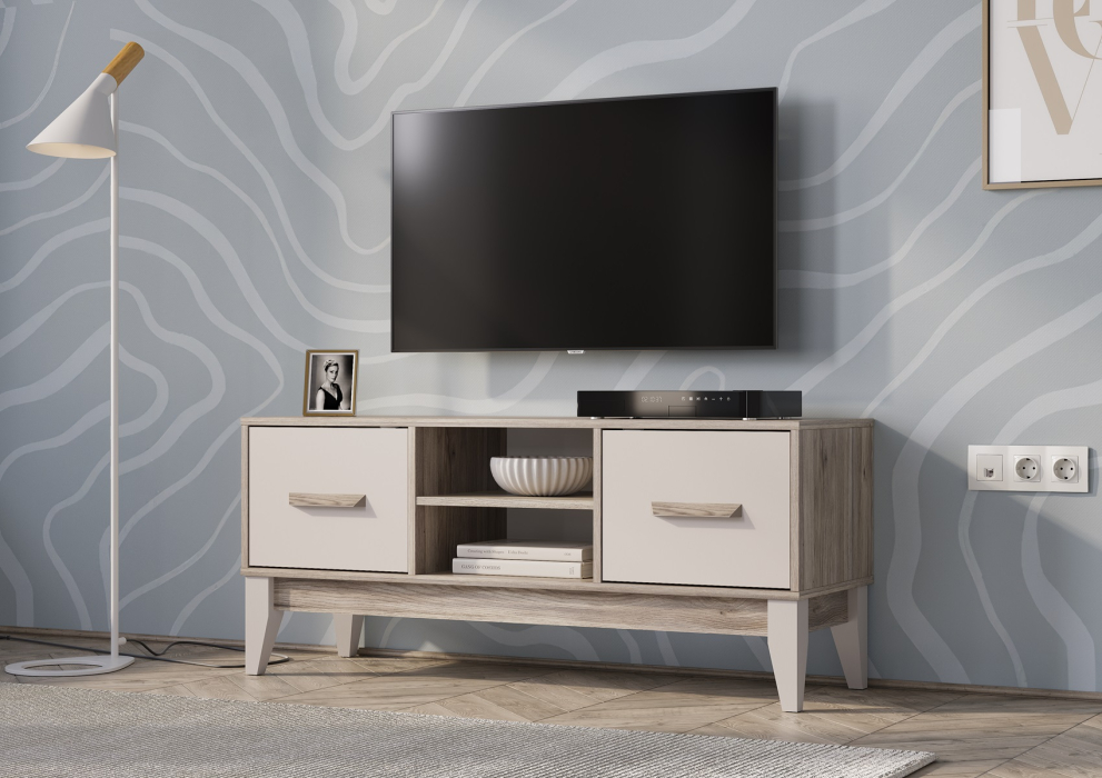 Многофункциональная тумба под ТВ Скандика – это две вместительных полки за дверцами и две открытых полки, которые позволят разместить всю нужную технику.