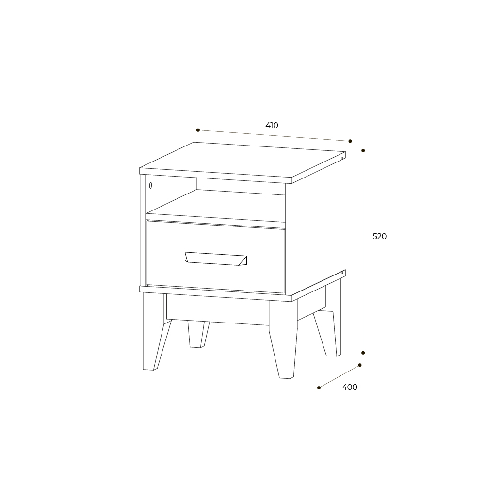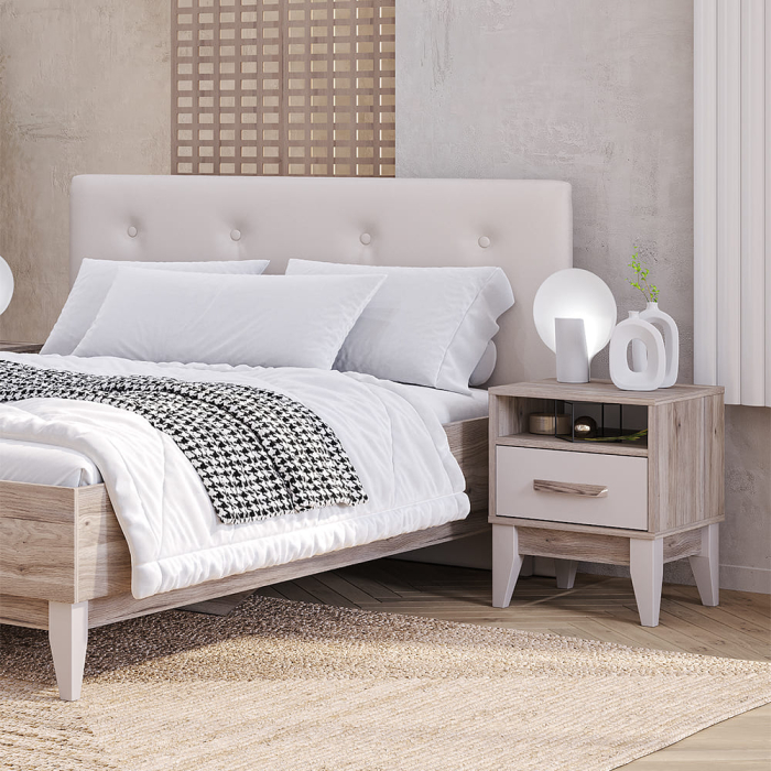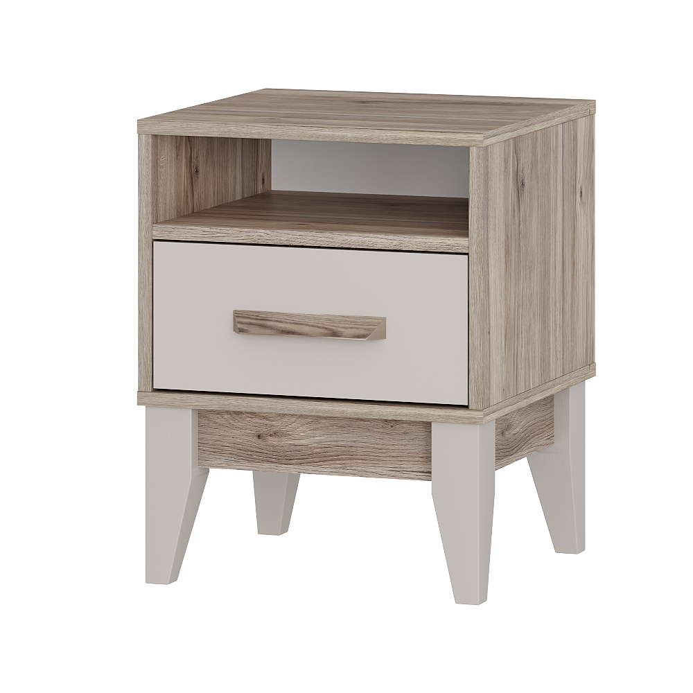 Прикроватная тумба из коллекции Скандика имеет открытую нишу для мелочей и один выкатной ящик на шариковых направляющих полного и бесшумного выдвижения, стильные эмалированные деревянные ножки из бука высотой 20 см позволят на всём пространстве пола использовать робот-пылесос. Ручка повторяют текстуру корпуса «дуб смоки».