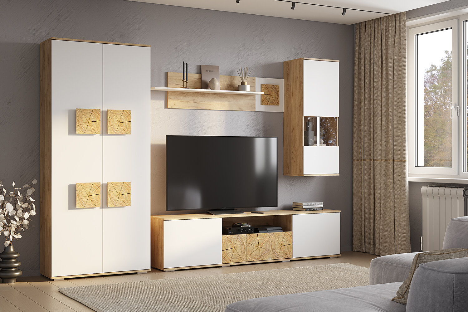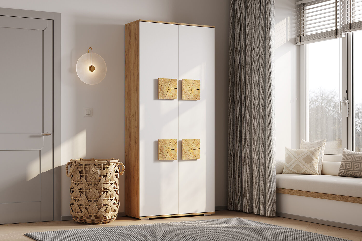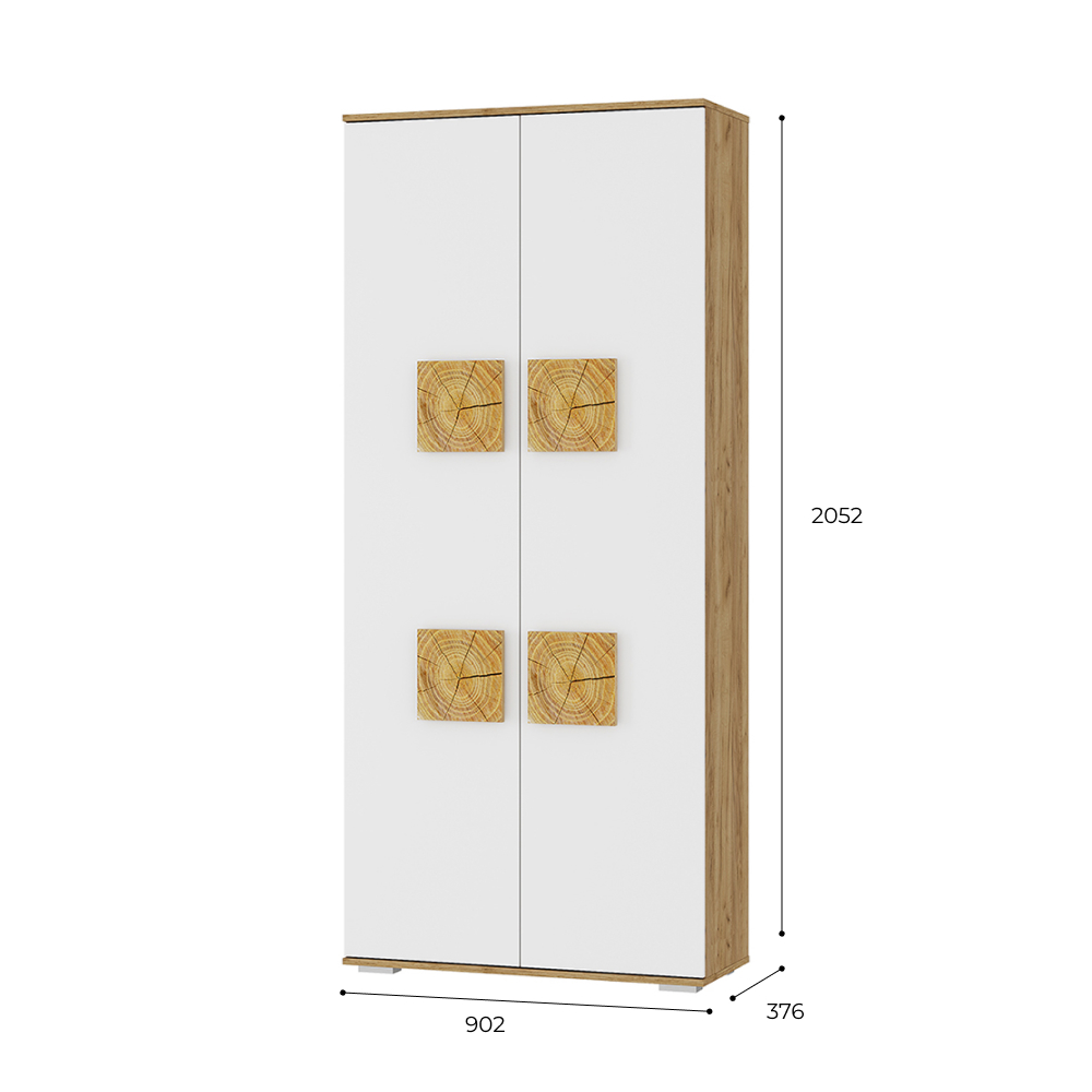 Вместительный распашной шкаф из модульной серии Тиволи. Лаконичный дизайн украшают оригинальные ручки, имитирующие спил дерева. За распашными дверьми Вы найдете множество полок, которые помогут организовать место хранения.