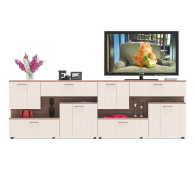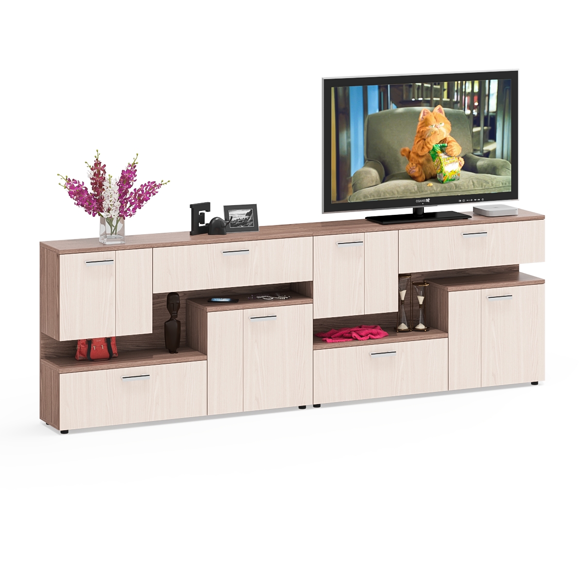 Конструктивно это две тумбы объединенные в одну широкую. Каждая тумба вместительна с четырьмя закрытыми отделениями и открытыми нишами - отличная подставка для домашнего кинотеатра. Широкий верхний горизонт тумб послужит надёжной полкой для установки телевизора любой диагонали. Тумбы оборудованы четырьмя вместительными отделениями с полкой за распашными дверками и четырьмя нишами без полок за откидными дверками. Кроме того, оригинальная конструкция тумб выделяет две двухярусные ниши, очень удобных для видео- и аудиоаппаратуры, декора, фото. Стильный дизайн, интересная форма тумб и модное сочетание цветовой гаммы поддержат гармонию вкуса Вашей современной обстановки. Широкая ТВ тумба С1-1400 не универсальна при сборке - собирается только так, как представлено на картинке.