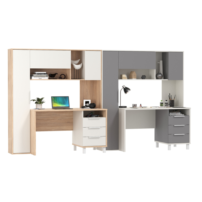 Столы не имеют универсальной сборки - тумбы расположены с правой стороны, а с левой стороны находятся пеналы с глухими распашными дверками и пятью полками внутри.