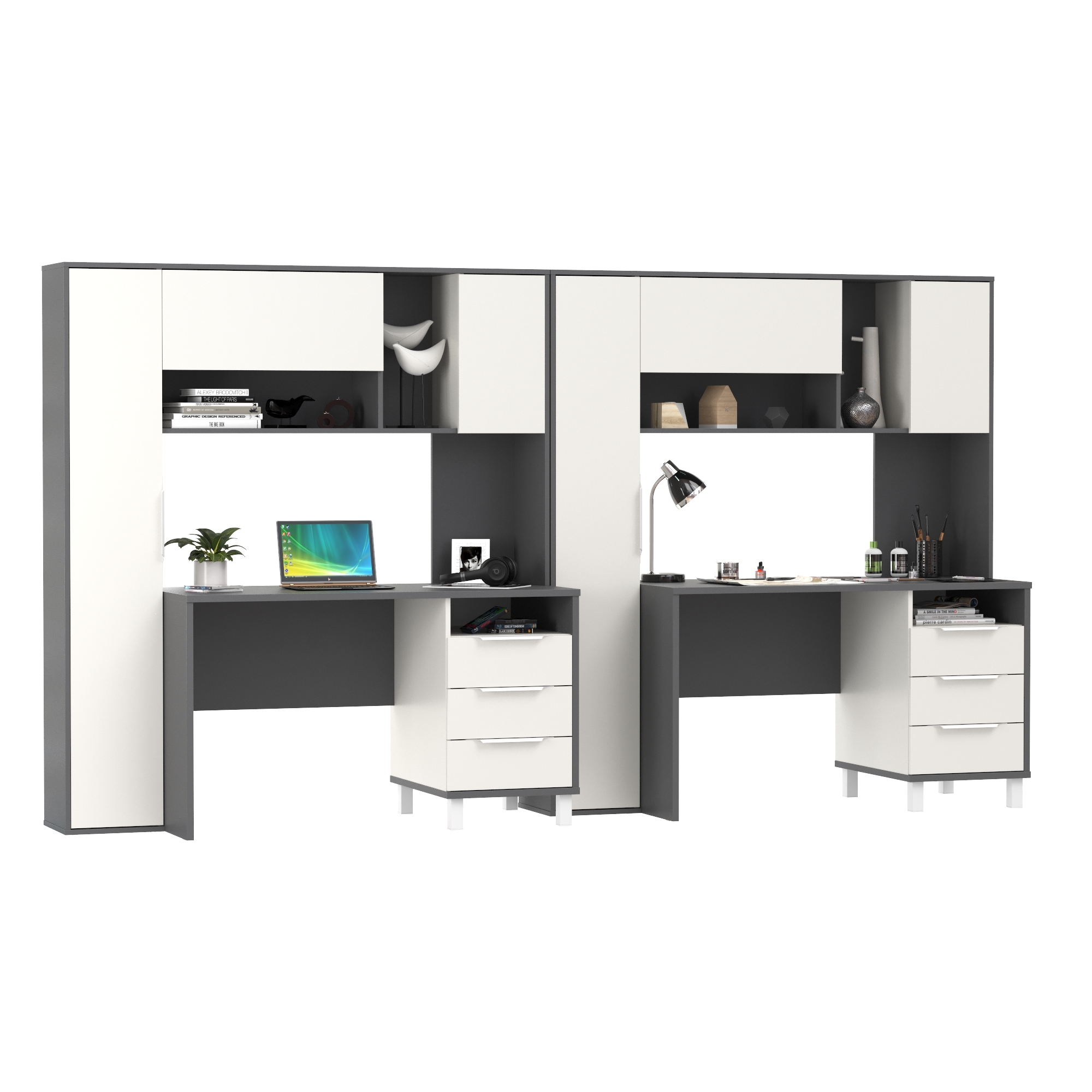 В комплекте два стола Комфорт 12.95N. Однотумбовые столы с ящиками, надстройки с закрытыми и открытыми отделениями, а также пеналы - это оптимальная комбинация для создания удобного рабочего пространства. Надстройки выделяют на столах удобные ниши, достаточные для установки мониторов, оргтехники и работы с множеством деловых бумаг. Система хранения в надстройках солидна и разнообразна - четыре закрытых отделения (два откидных и два распашных с полкой) и четыре открытые ниши. Для канцелярии и часто востребованных документов каждый стол Комфорт 12.95N оборудован тремя выдвижными ящиками и нишей над ними.