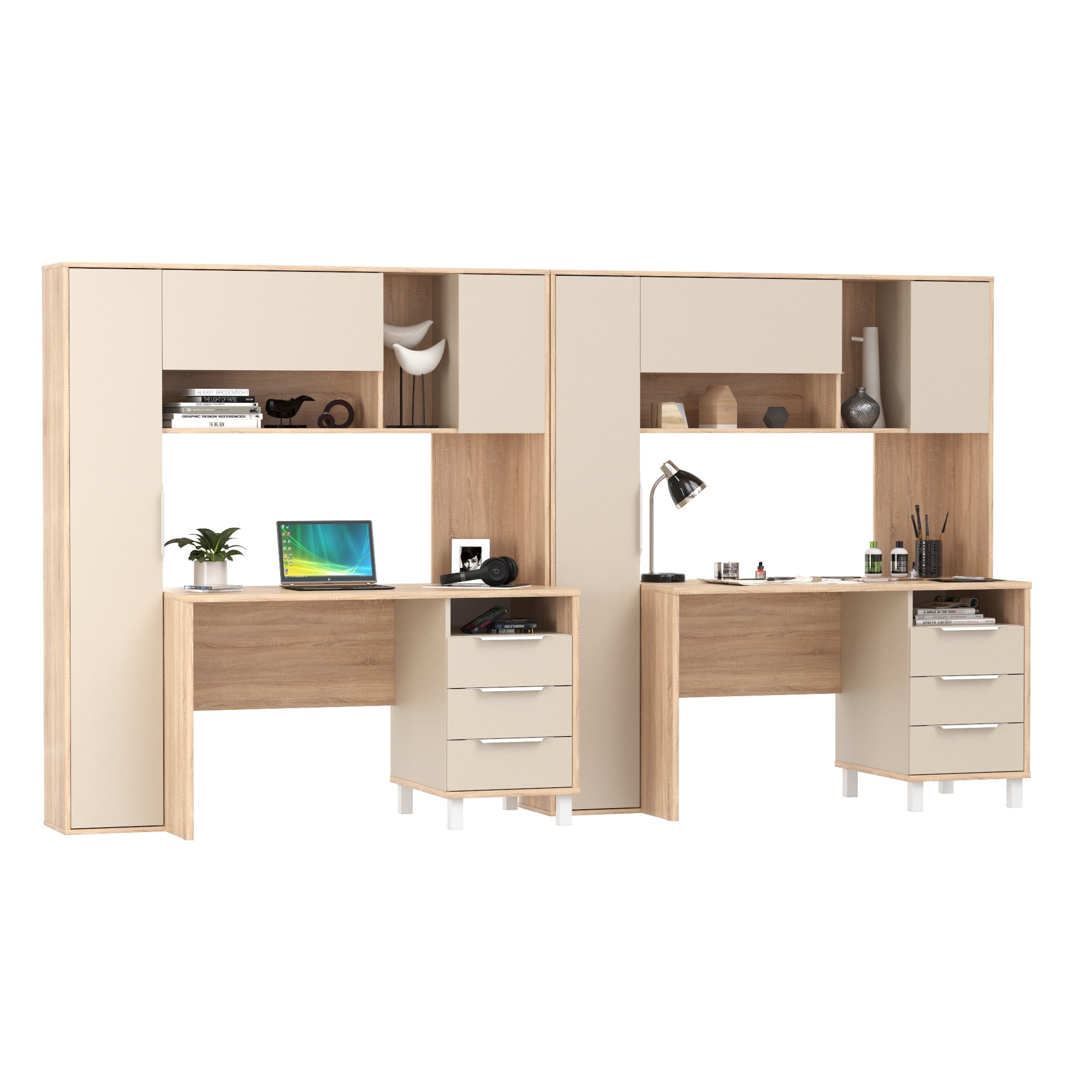 В комплекте два стола Комфорт 12.95N. Однотумбовые столы с ящиками, надстройки с закрытыми и открытыми отделениями, а также пеналы - это оптимальная комбинация для создания удобного рабочего пространства. Надстройки выделяют на столах удобные ниши, достаточные для установки мониторов, оргтехники и работы с множеством деловых бумаг. Система хранения в надстройках солидна и разнообразна - четыре закрытых отделения (два откидных и два распашных с полкой) и четыре открытые ниши. Для канцелярии и часто востребованных документов каждый стол Комфорт 12.95N оборудован тремя выдвижными ящиками и нишей над ними.