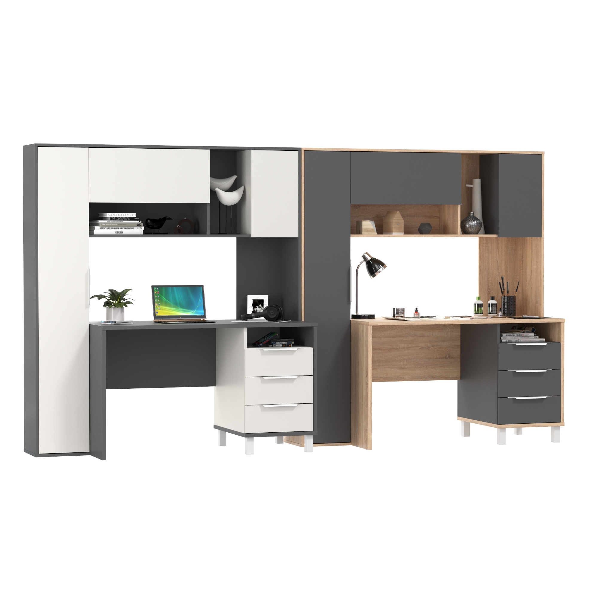 Столы не имеют универсальной сборки - тумбы расположены с правой стороны, а с левой стороны находятся пеналы с глухими распашными дверками и пятью полками внутри.