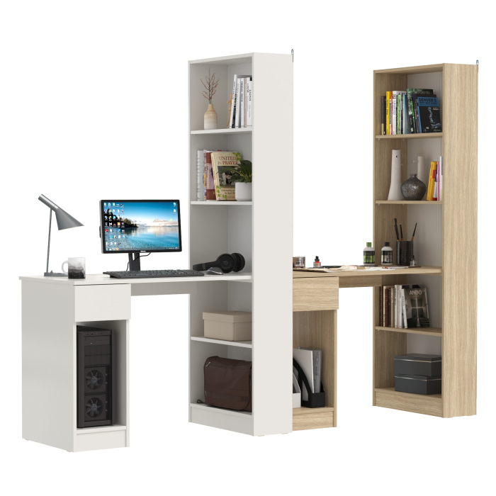 Эти столы идеально подходят для совместной работы или учебы, предлагая достаточно места для каждого пользователя. Столы оснащены вместительными столешницами, позволяющими разместить все необходимое оборудование, включая компьютер, монитор и канцелярские принадлежности. С одной стороны столешница каждого стола закреплена на тумбе, с другой - на полочке открытого стеллажа. Стеллажи, интегрированные в конструкции, добавляют дополнительные возможности для хранения книг, документов и личных вещей, обеспечивая порядок и легкий доступ к необходимым предметам. Тумбы столов имеют выдвижной ящик и открытую нишу для системного блока стационарного компьютера. Если же, у Вас в пользовании ноутбук, ниши пригодятся для размещения портфеля, сумочки или рюкзака. Стеллажи в данной конструкции значительно увеличивает комфорт рабочего места. На восьми полочках стеллажей можно разместить все, что необходимо для результативной работы или учёбы. Папки с документами, журналы, учебники и книги, мелкая офисная техника, предметы декора или игрушки. Завершив работу, положите на полочку сложенный ноутбук и освободите столешницу для игры с ребенком или собирания пазлов. Столы универсальны при сборке - стеллажи можно расположить как с левой стороны, так и с правой.
