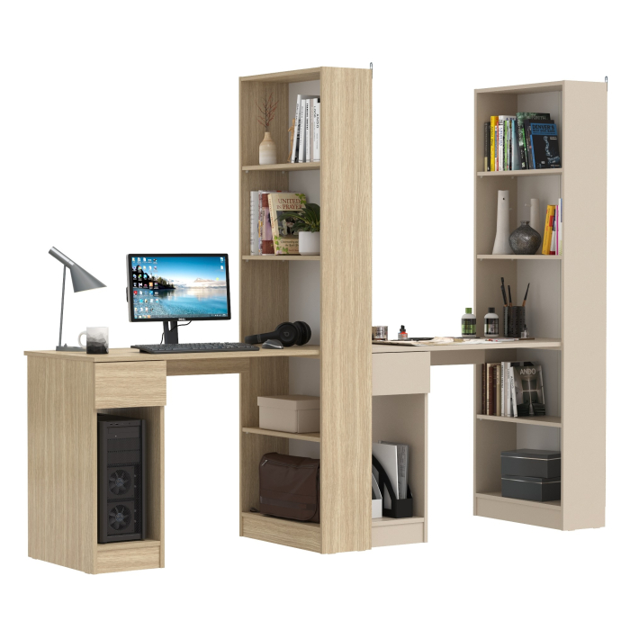 Эти столы идеально подходят для совместной работы или учебы, предлагая достаточно места для каждого пользователя. Столы оснащены вместительными столешницами, позволяющими разместить все необходимое оборудование, включая компьютер, монитор и канцелярские принадлежности. С одной стороны столешница каждого стола закреплена на тумбе, с другой - на полочке открытого стеллажа. Стеллажи, интегрированные в конструкции, добавляют дополнительные возможности для хранения книг, документов и личных вещей, обеспечивая порядок и легкий доступ к необходимым предметам. Тумбы столов имеют выдвижной ящик и открытую нишу для системного блока стационарного компьютера. Если же, у Вас в пользовании ноутбук, ниши пригодятся для размещения портфеля, сумочки или рюкзака. Стеллажи в данной конструкции значительно увеличивает комфорт рабочего места. На восьми полочках стеллажей можно разместить все, что необходимо для результативной работы или учёбы. Папки с документами, журналы, учебники и книги, мелкая офисная техника, предметы декора или игрушки. Завершив работу, положите на полочку сложенный ноутбук и освободите столешницу для игры с ребенком или собирания пазлов. Столы универсальны при сборке - стеллажи можно расположить как с левой стороны, так и с правой.