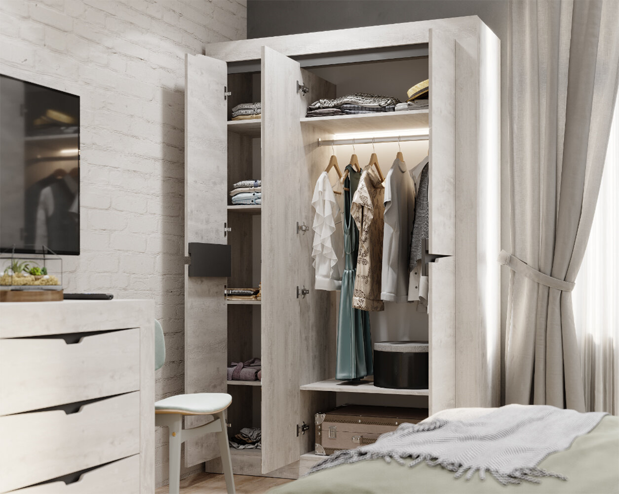 Трехстворчатый распашной шкаф Леонардо из одноименной модульной коллекции поможет организовать хранение в вашей спальне. Приятный спокойные оттенки придадут спальне атмосферу спокойствия и позволят вам расслабится. За распашными фасадами вы найдете отсек с полками и штангу для одежды с антресолью и полкой для коробок обуви. На фасаде центральной створки находится зеркало.