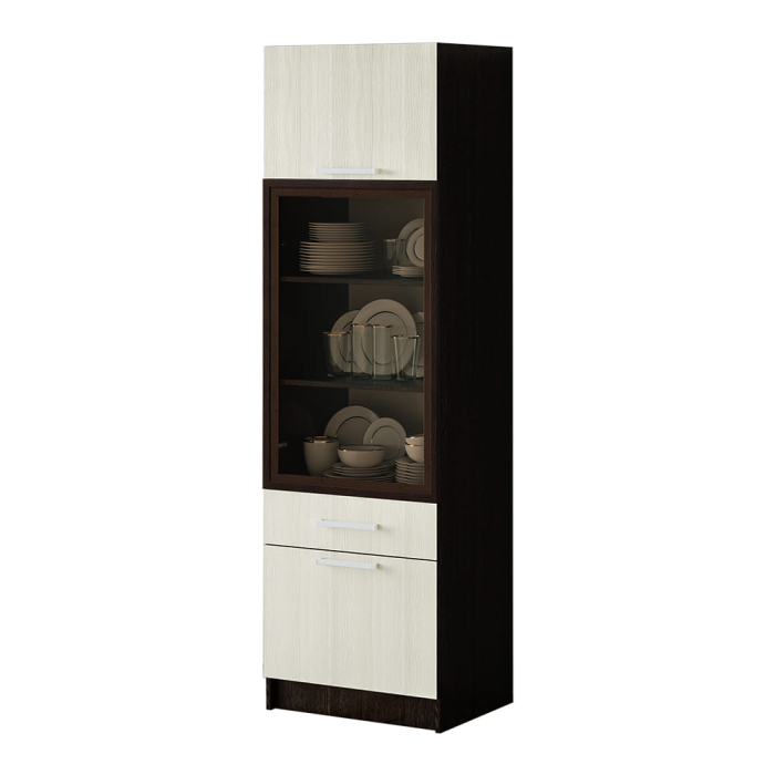 Шкаф для посуды Фиеста в цветах венге и лоредо — это стильное и функциональное решение для вашей кухни. Он оснащён распашной стеклостворкой в центральном фасаде и навесными полками. Удобные антресоль и нижнее отделение закрыты фасадами в цвете «Лоредо». Полновстраиваемый ящик на шариковых направляющих позволяет хранить ваши документы в безопасности.