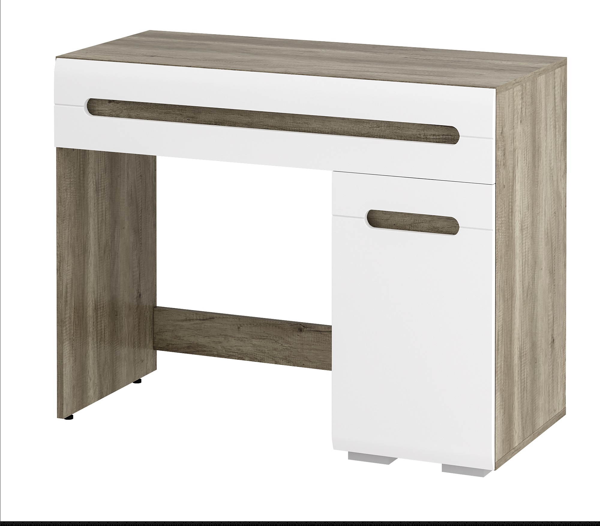 Туалетный стол с широким ящиком и двумя закрытыми нишами. Благодаря универсальной конструкции может использоваться не только в процессе нанесения макияжа, но и для работы или учебы, как письменный стол.