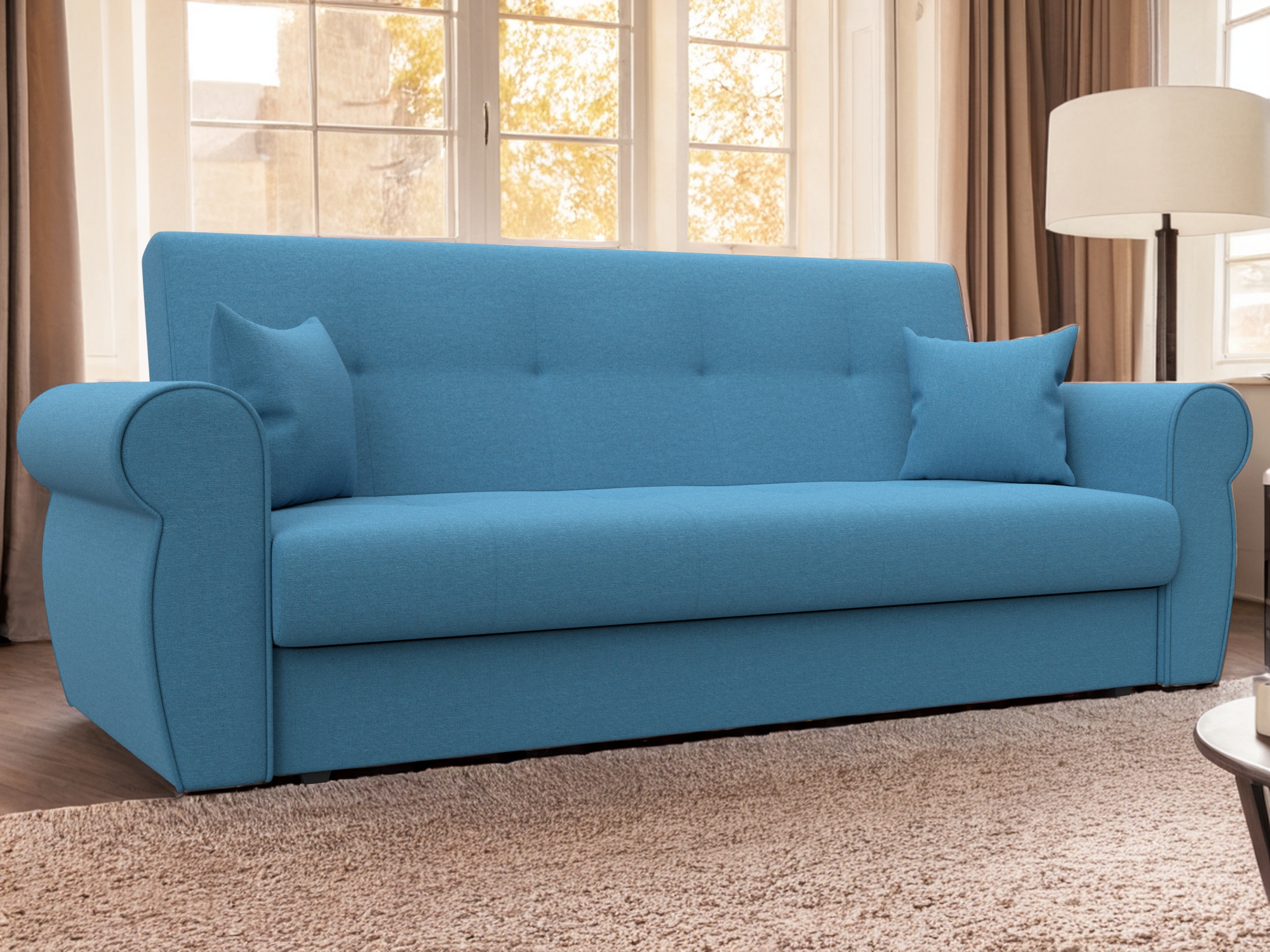 Недорогой надежный диван «Лига-019» с механизмом раскладки «книжка» прост в эксплуатации, а также отлично впишется в интерьер как жилой комнаты, так и офиса. Мягкие округлые подлокотники и две декоративные подушки обеспечат удобство и комфортный отдых. Под сиденьем находится вместительная ящик для белья размером 178х69х19 см. Конструкция функциональна, трансформируется в кровать. Диван-книжка станет выгодным приобретением для вашего дома и неотделимым элементом интерьера.