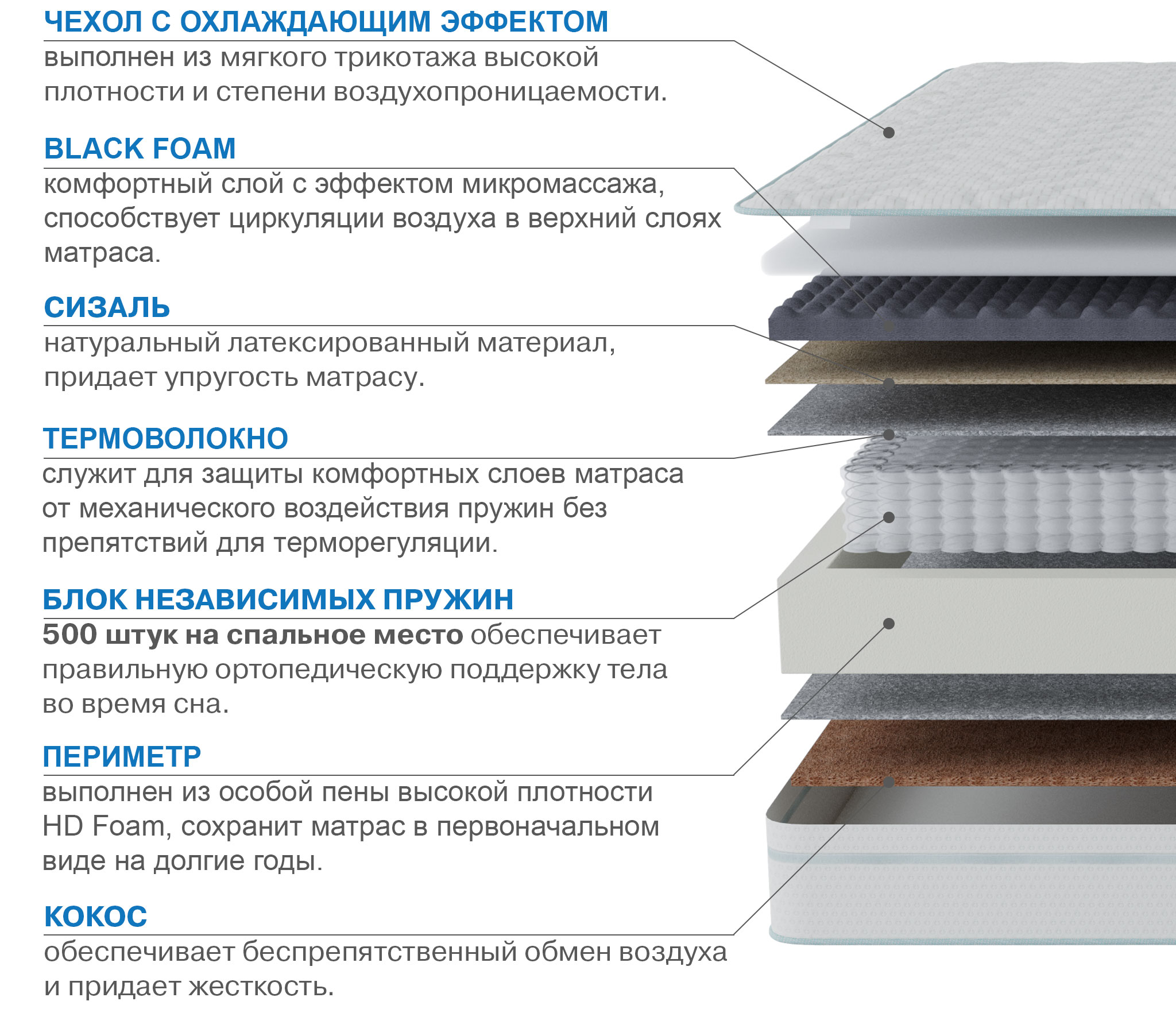 Комфортные слои одной из сторон матраса состоят из комбинации особо мягкой ячеистой пены с мемори Memory Foam и натурального латексированного сизаля. Слой латексированного сизаля увеличивает вентиляцию матраса, распределяет давление по всей площади и придает необходимую жесткость, а особо мягкая ячеистая пена с мемори Memory Foam создает воздушность и комфорт, обладает микромассажным эффектом, увеличивает кровоснабжение, снижая риск пережатия сосудов.