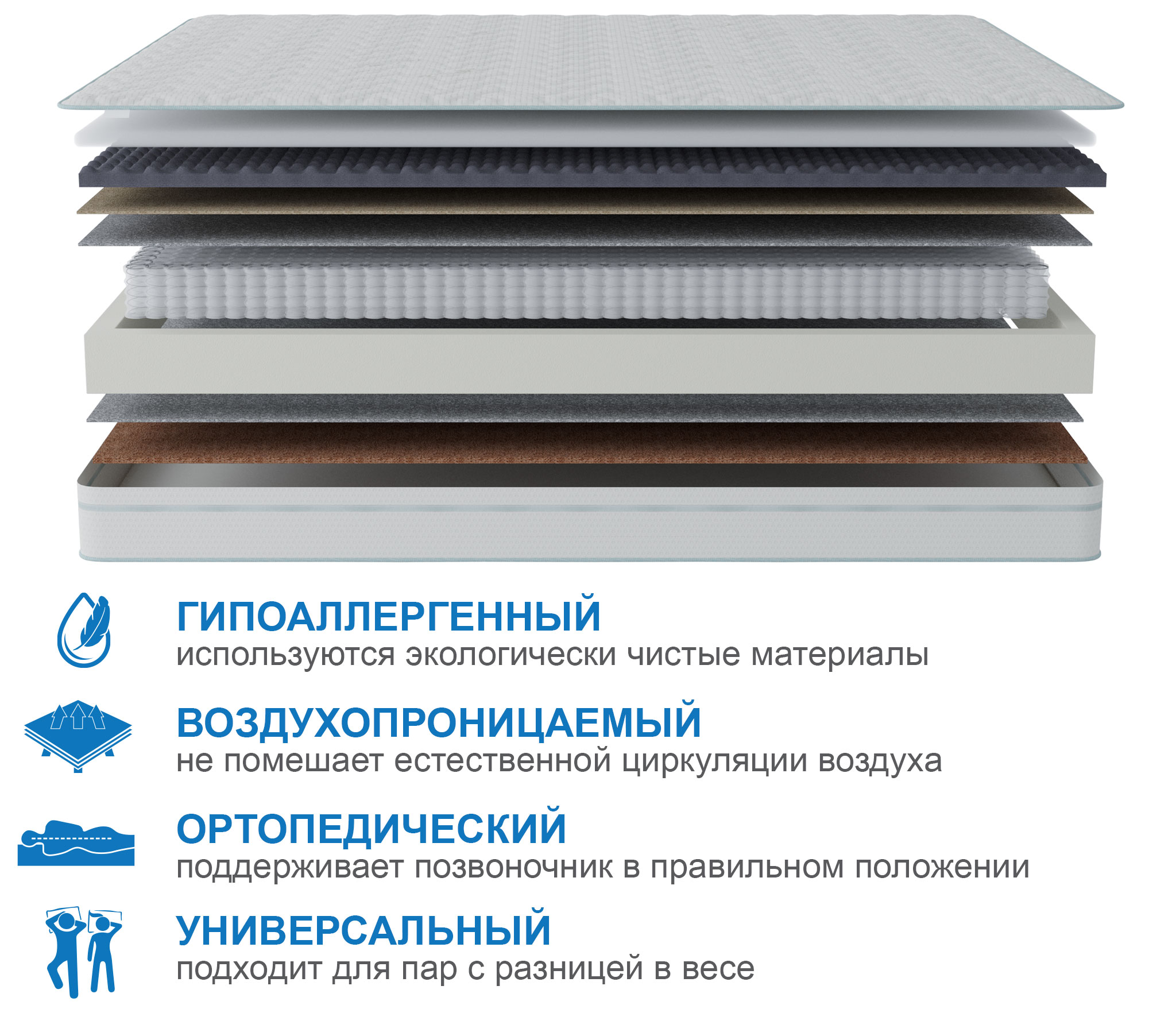 В матрасе осуществляется необходимая циркуляция воздуха, а все материалы, используемые в нем, являются гипоаллергенными.