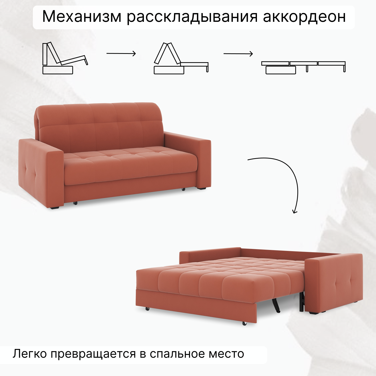 Особенностью данной модели является механизм аккордеон. Благодаря ему, диван легко превращается в кровать, обеспечивая удобство и простоту использования. Размеры спального места составляют 120*200 см, что позволяет использовать его как полноценную кровать.