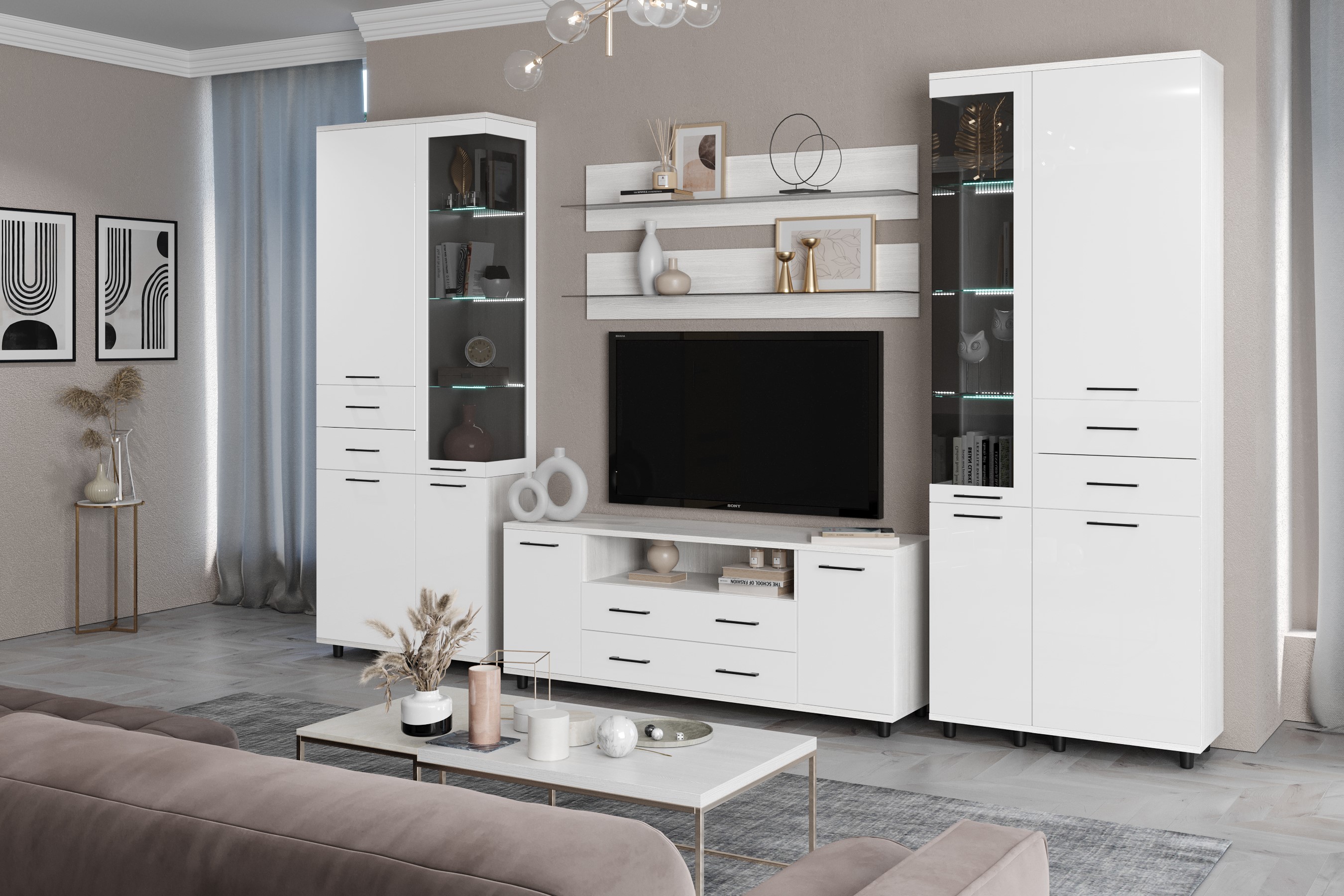 Коллекция мебели для гостиной «Грейс» предлагает широкий выбор модулей, стилистически и функционально сочетающихся между собой.
