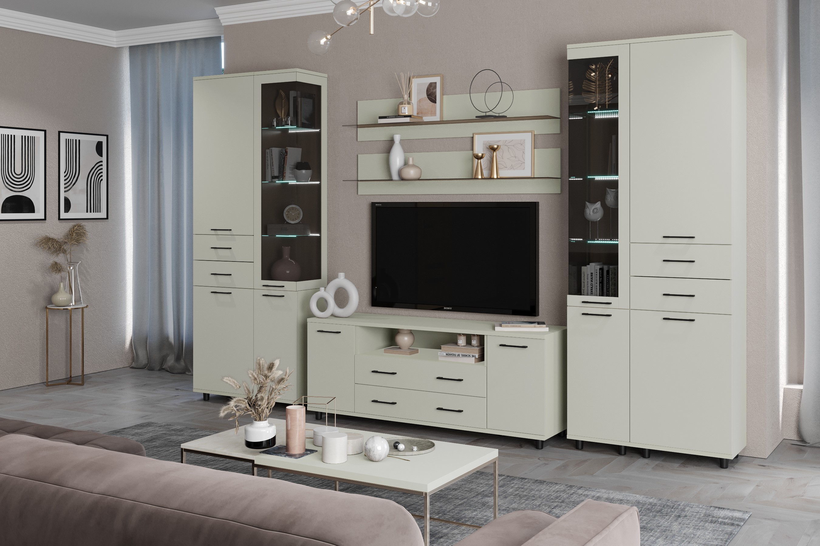 Коллекция мебели для гостиной «Грейс» предлагает широкий выбор модулей, стилистически и функционально сочетающихся между собой.