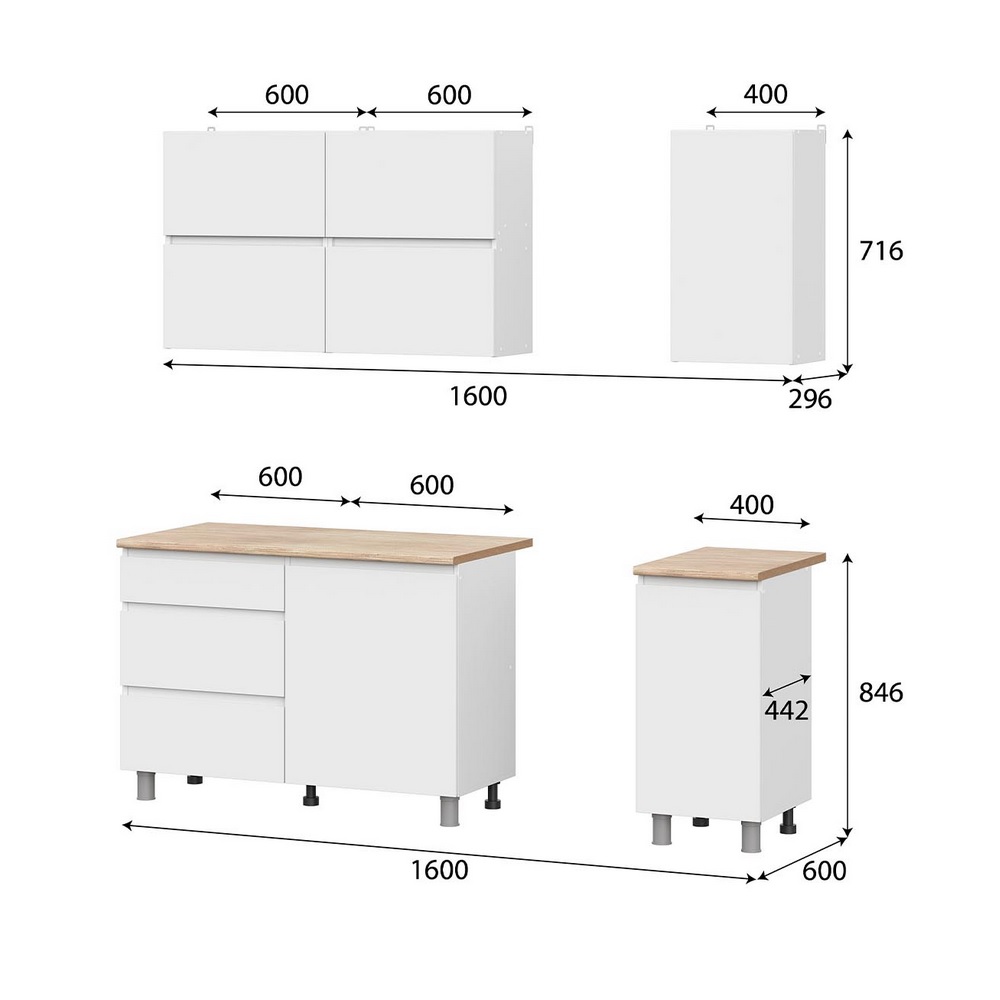 -Нижние модули комплектуются столешницей 26 мм.