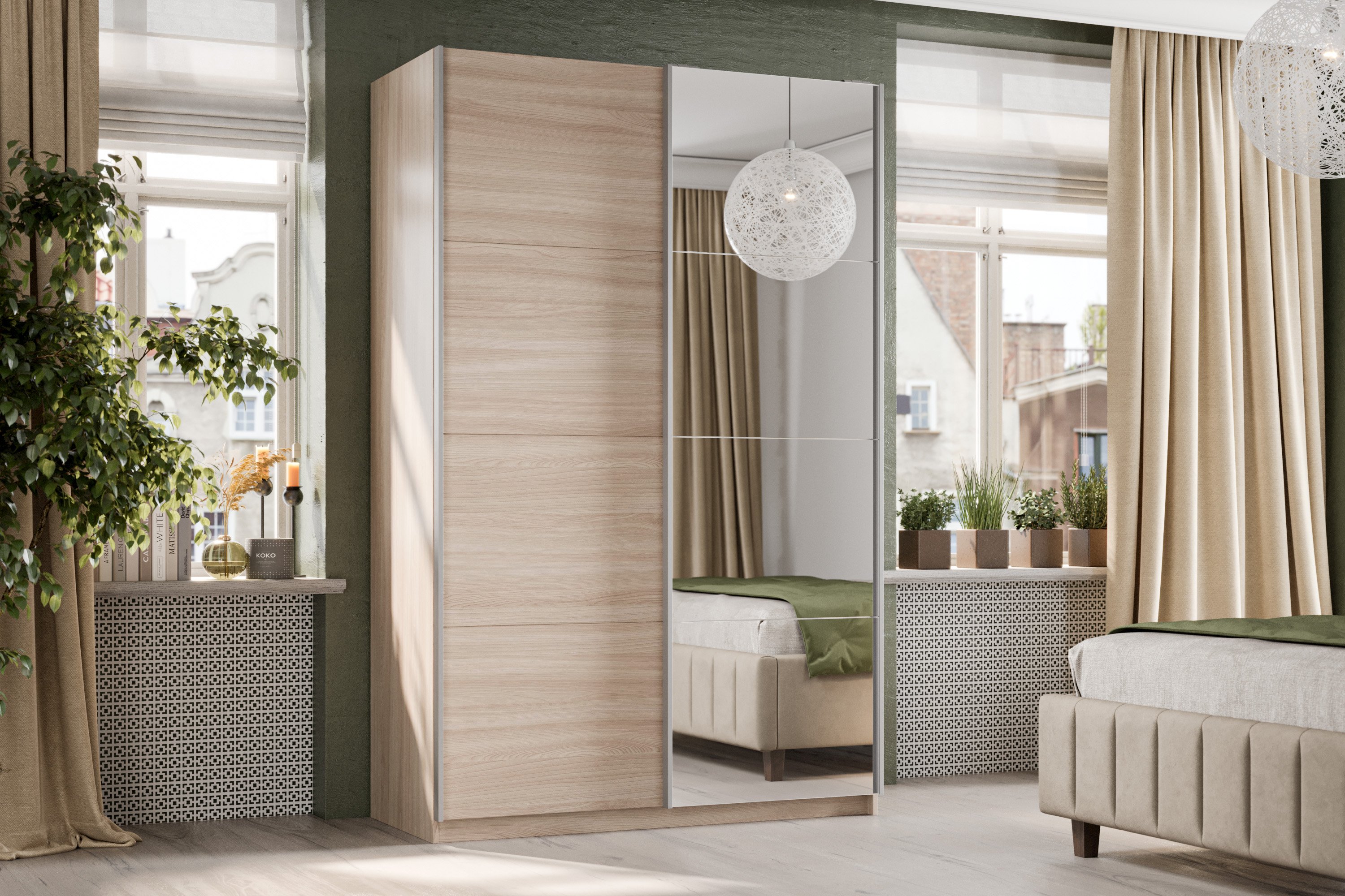 Корпус выполнен из ламинированного ДСП и оснащен качественной верхней подвесной системой-купе со встроенными доводчиками производства фирмы Hettiсh, изготовленной из легкого и прочного алюминия .
