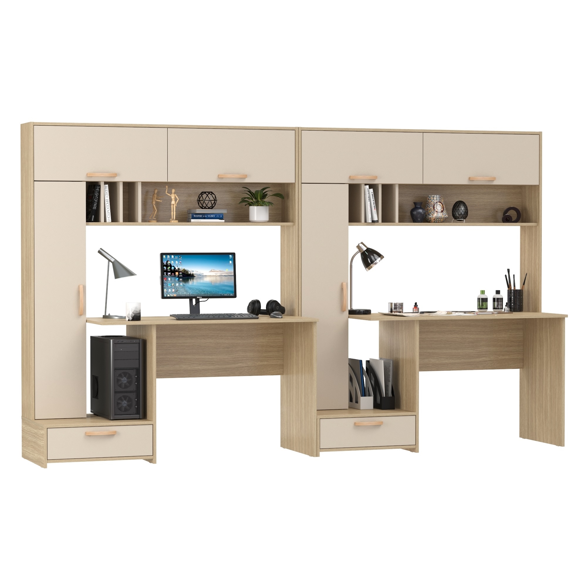 Эти столы не только обеспечат комфортное рабочее пространство для двоих, но и могут заменить компактную стенку в детской комнате или кабинете. Каждый стол обладает широкой столешницей, идеально подходящей для учебы, работы за компьютером или выполнения других задач. Надстройка, расположенная над столешницей, снабжена открытой полкой с перегородками для книг, учебников и других полезных мелочей. Помимо этого, надстройка оснащена закрытыми нишами с откидными фасадами, что позволяет хранить документы и личные вещи в порядке и в пределах легкой доступности. Сбоку каждого стола расположен пенал с тремя полками за распашной дверью, что обеспечивает дополнительное место для хранения. Пенал установлен на тумбу с выдвижным ящиком для канцелярии или мелких принадлежностей. В конструкции предусмотрено открытое пространство сбоку от столешницы, где можно разместить системный блок стационарного компьютера, освобождая место на столе.