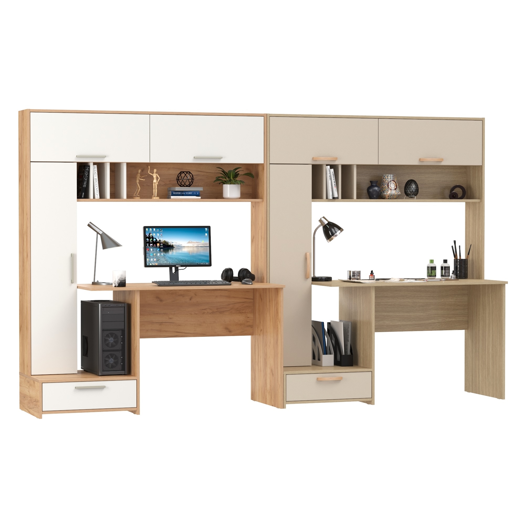 Эти столы не только обеспечат комфортное рабочее пространство для двоих, но и могут заменить компактную стенку в детской комнате или кабинете. Каждый стол обладает широкой столешницей, идеально подходящей для учебы, работы за компьютером или выполнения других задач. Надстройка, расположенная над столешницей, снабжена открытой полкой с перегородками для книг, учебников и других полезных мелочей. Помимо этого, надстройка оснащена закрытыми нишами с откидными фасадами, что позволяет хранить документы и личные вещи в порядке и в пределах легкой доступности. Сбоку каждого стола расположен пенал с тремя полками за распашной дверью, что обеспечивает дополнительное место для хранения. Пенал установлен на тумбу с выдвижным ящиком для канцелярии или мелких принадлежностей. В конструкции предусмотрено открытое пространство сбоку от столешницы, где можно разместить системный блок стационарного компьютера, освобождая место на столе.