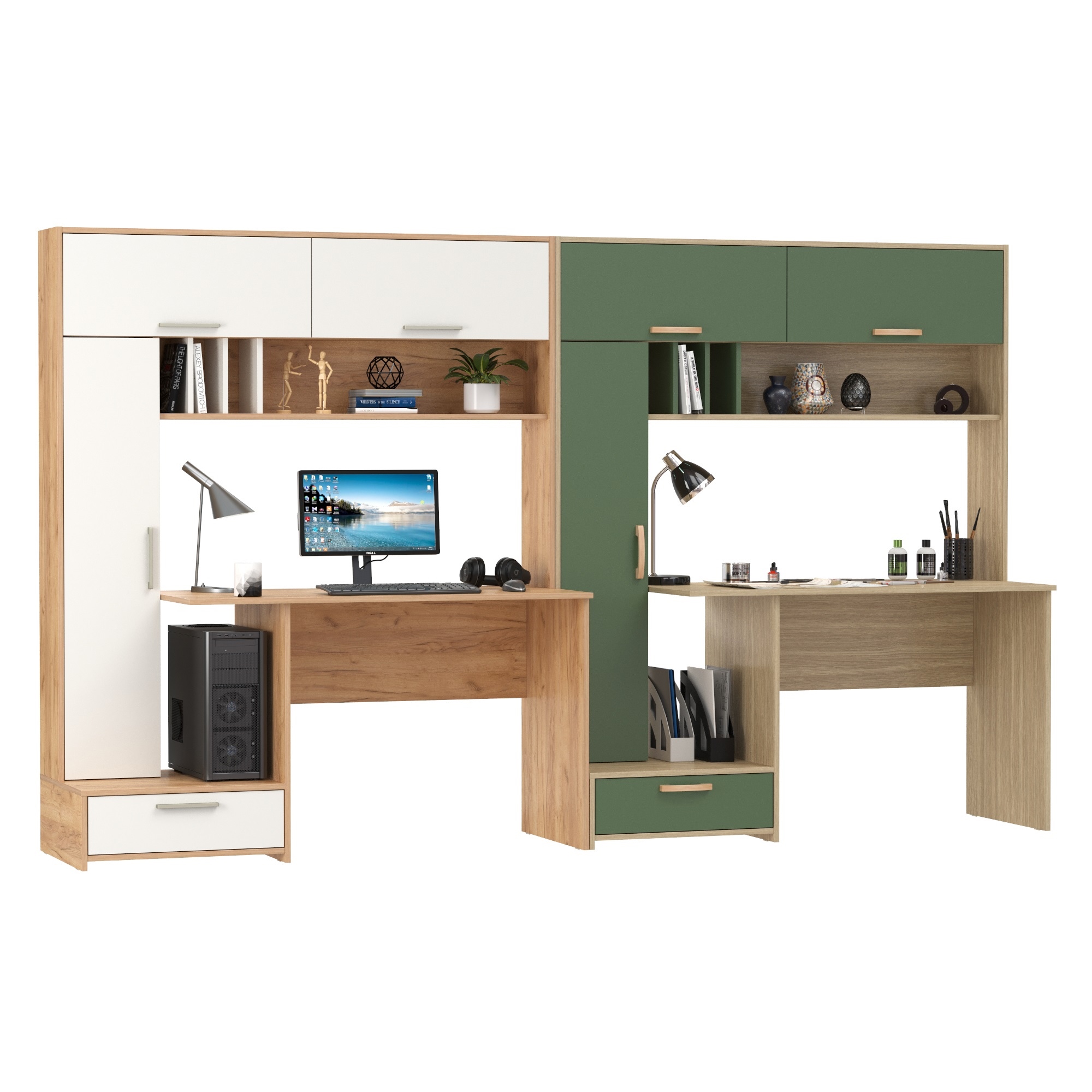 Эти столы не только обеспечат комфортное рабочее пространство для двоих, но и могут заменить компактную стенку в детской комнате или кабинете. Каждый стол обладает широкой столешницей, идеально подходящей для учебы, работы за компьютером или выполнения других задач. Надстройка, расположенная над столешницей, снабжена открытой полкой с перегородками для книг, учебников и других полезных мелочей. Помимо этого, надстройка оснащена закрытыми нишами с откидными фасадами, что позволяет хранить документы и личные вещи в порядке и в пределах легкой доступности. Сбоку каждого стола расположен пенал с тремя полками за распашной дверью, что обеспечивает дополнительное место для хранения. Пенал установлен на тумбу с выдвижным ящиком для канцелярии или мелких принадлежностей. В конструкции предусмотрено открытое пространство сбоку от столешницы, где можно разместить системный блок стационарного компьютера, освобождая место на столе.