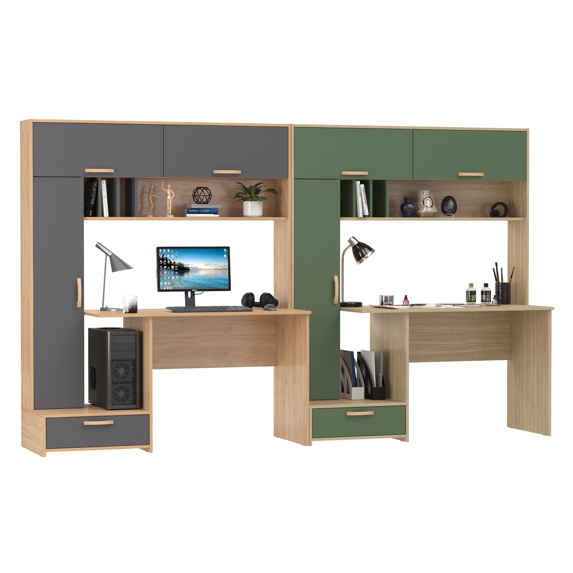Эти столы не только обеспечат комфортное рабочее пространство для двоих, но и могут заменить компактную стенку в детской комнате или кабинете. Каждый стол обладает широкой столешницей, идеально подходящей для учебы, работы за компьютером или выполнения других задач. Надстройка, расположенная над столешницей, снабжена открытой полкой с перегородками для книг, учебников и других полезных мелочей. Помимо этого, надстройка оснащена закрытыми нишами с откидными фасадами, что позволяет хранить документы и личные вещи в порядке и в пределах легкой доступности. Сбоку каждого стола расположен пенал с тремя полками за распашной дверью, что обеспечивает дополнительное место для хранения. Пенал установлен на тумбу с выдвижным ящиком для канцелярии или мелких принадлежностей. В конструкции предусмотрено открытое пространство сбоку от столешницы, где можно разместить системный блок стационарного компьютера, освобождая место на столе.