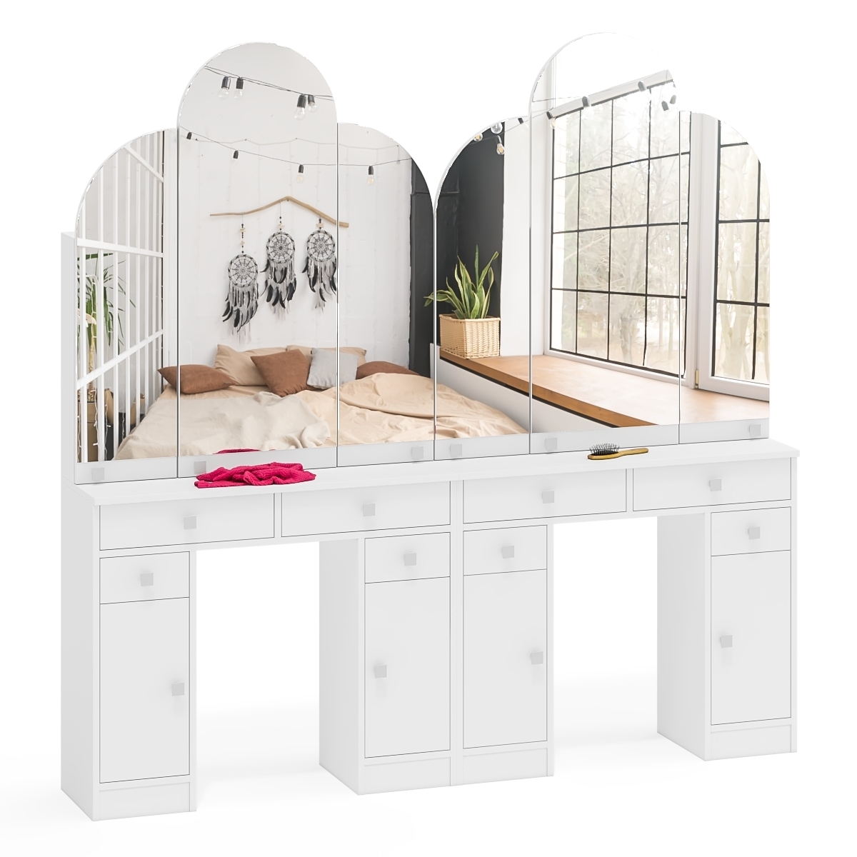 Каждый из столиков оборудован тремя зеркальными панелями - центральное зеркало (ширина 395 мм, высота 980 мм) и два боковых (ширина 245 мм, высота 780 мм), что создаёт эффект трельяжа и позволяет комфортно следить за собой с разных ракурсов. Зеркальное полотно толщиной 4 мм. За каждой из зеркальных панелей скрываются удобные полочки для хранения косметики и других аксессуаров. За центральной зеркальной дверцей скрывается удобное отделение с двумя полками для хранения косметики, аксессуаров или других мелочей. Боковые зеркала также оснащены дверцами, за каждой из которых расположено по одной полочке, что делает хранение вещей максимально организованным и удобным. Под столешницей каждого столика находятся два выдвижных ящика для хранения мелочей, а по бокам — тумбы с выдвижными ящиками и полками за распашными дверцами. Это решение позволяет эффективно организовать хранение, создавая гармоничный порядок в интерьере.