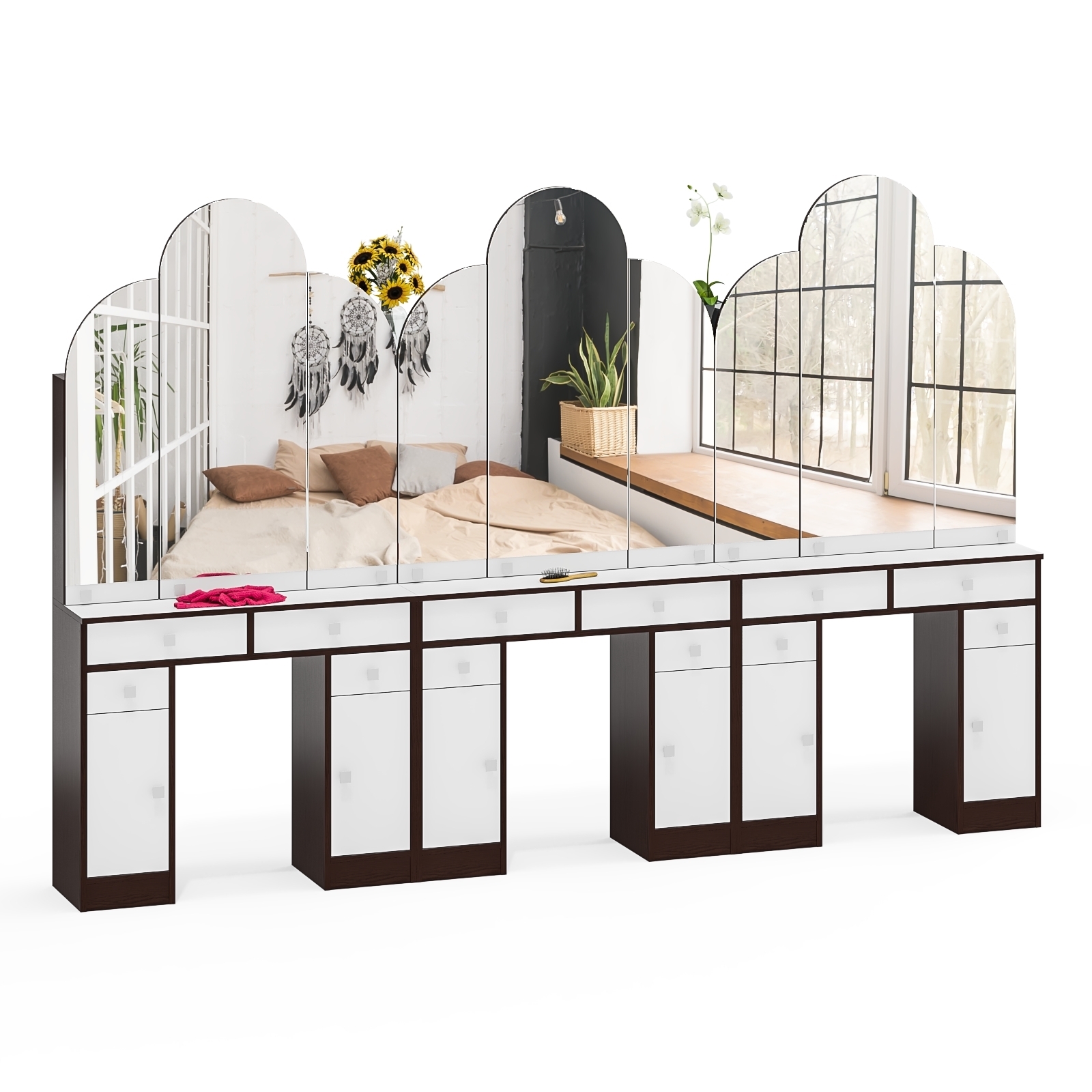 Каждый из столиков оборудован тремя зеркальными панелями - центральное зеркало (ширина 395 мм, высота 980 мм) и два боковых (ширина 245 мм, высота 780 мм), что создаёт эффект трельяжа и позволяет комфортно следить за собой с разных ракурсов. Зеркальное полотно толщиной 4 мм. За каждой из зеркальных панелей скрываются удобные полочки для хранения косметики и других аксессуаров. За центральной зеркальной дверцей скрывается удобное отделение с двумя полками для хранения косметики, аксессуаров или других мелочей. Боковые зеркала также оснащены дверцами, за каждой из которых расположено по одной полочке, что делает хранение вещей максимально организованным и удобным. Под столешницей каждого столика находятся два выдвижных ящика для хранения мелочей, а по бокам — тумбы с выдвижными ящиками и полками за распашными дверцами. Это решение позволяет эффективно организовать хранение, создавая гармоничный порядок в интерьере.
