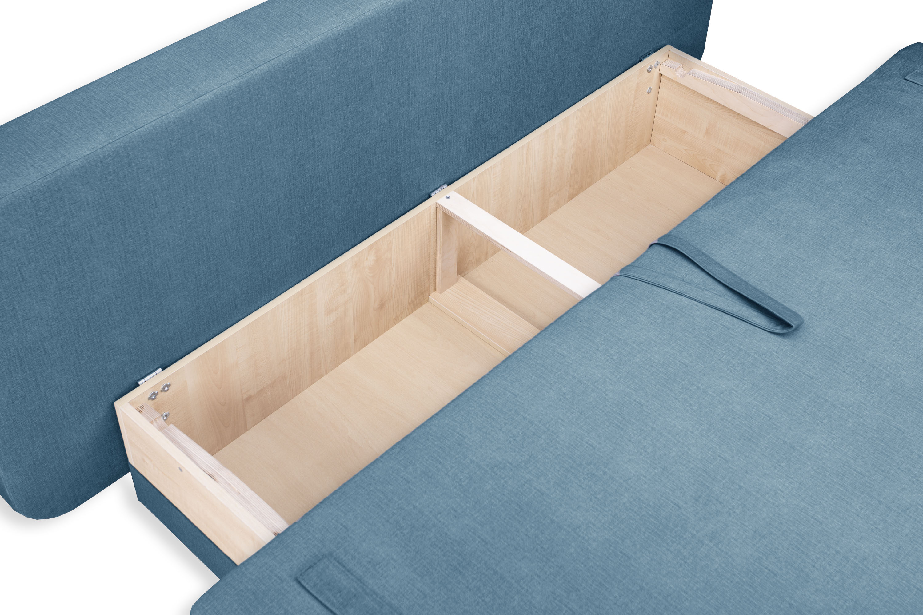 Под сиденьем расположен вместительный ящик для хранения. Видимая часть ящика обита тканью.