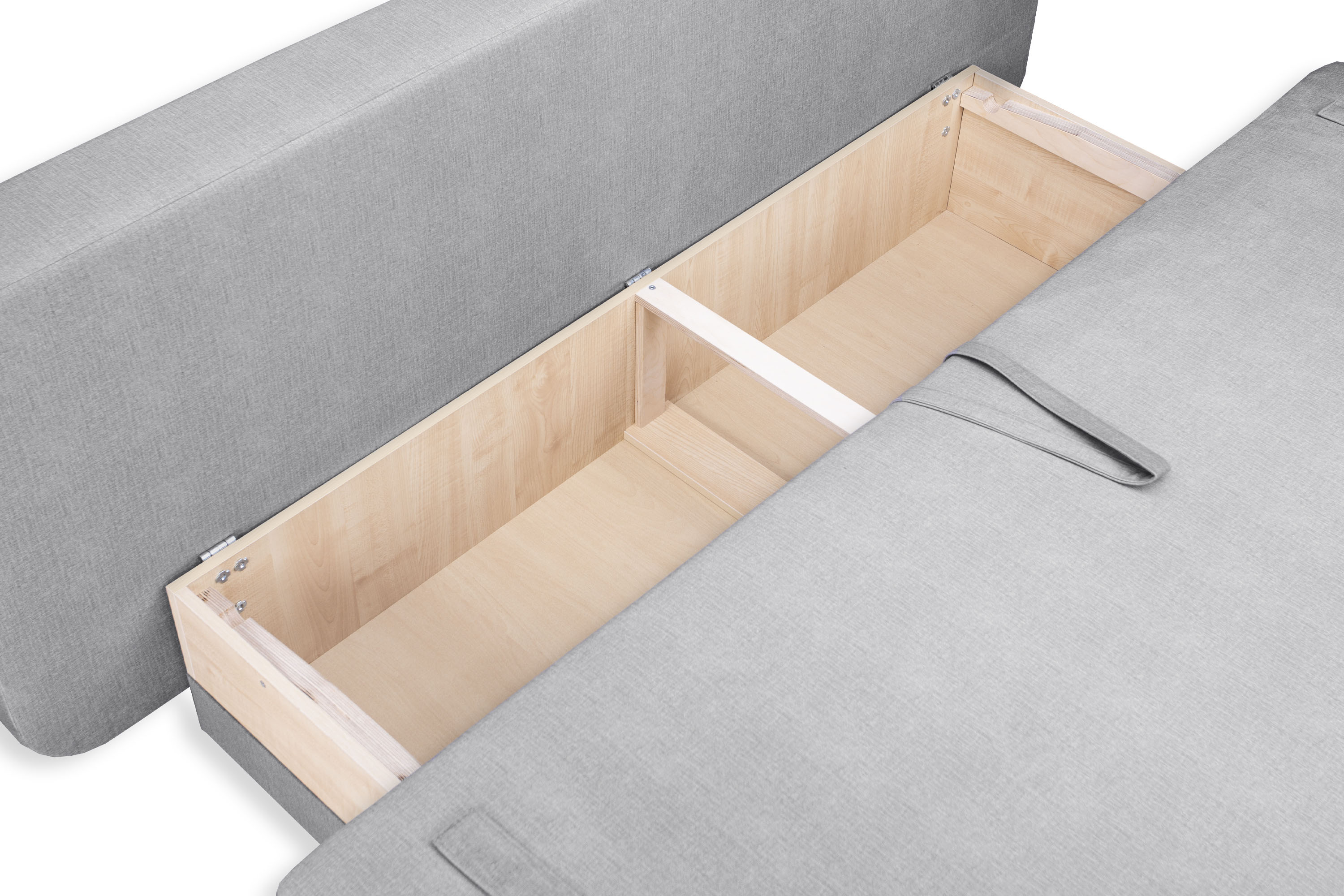 Под сиденьем расположен вместительный ящик для хранения. Видимая часть ящика обита тканью.