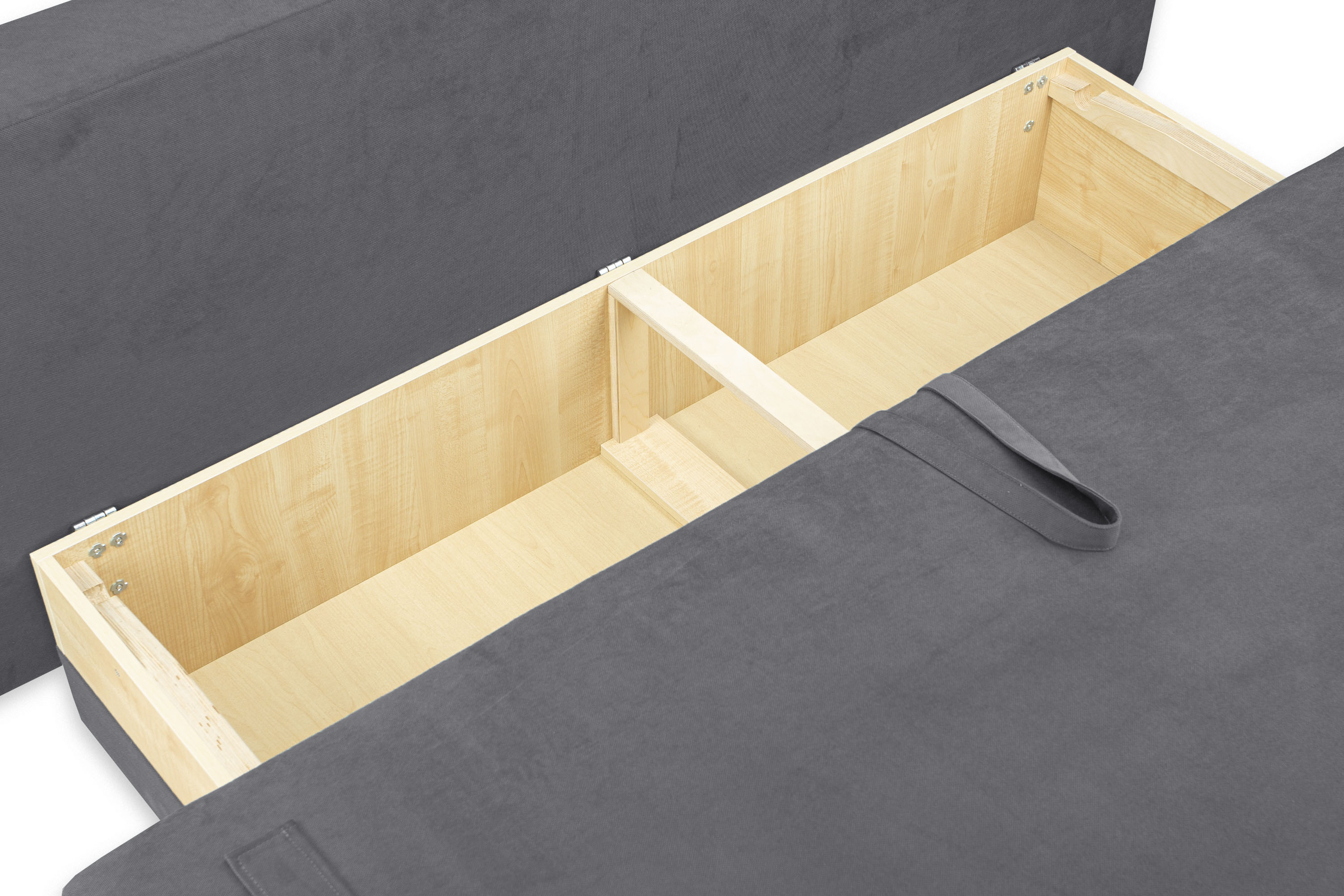 Под сиденьем расположен вместительный ящик для хранения. Видимая часть ящика обита тканью.