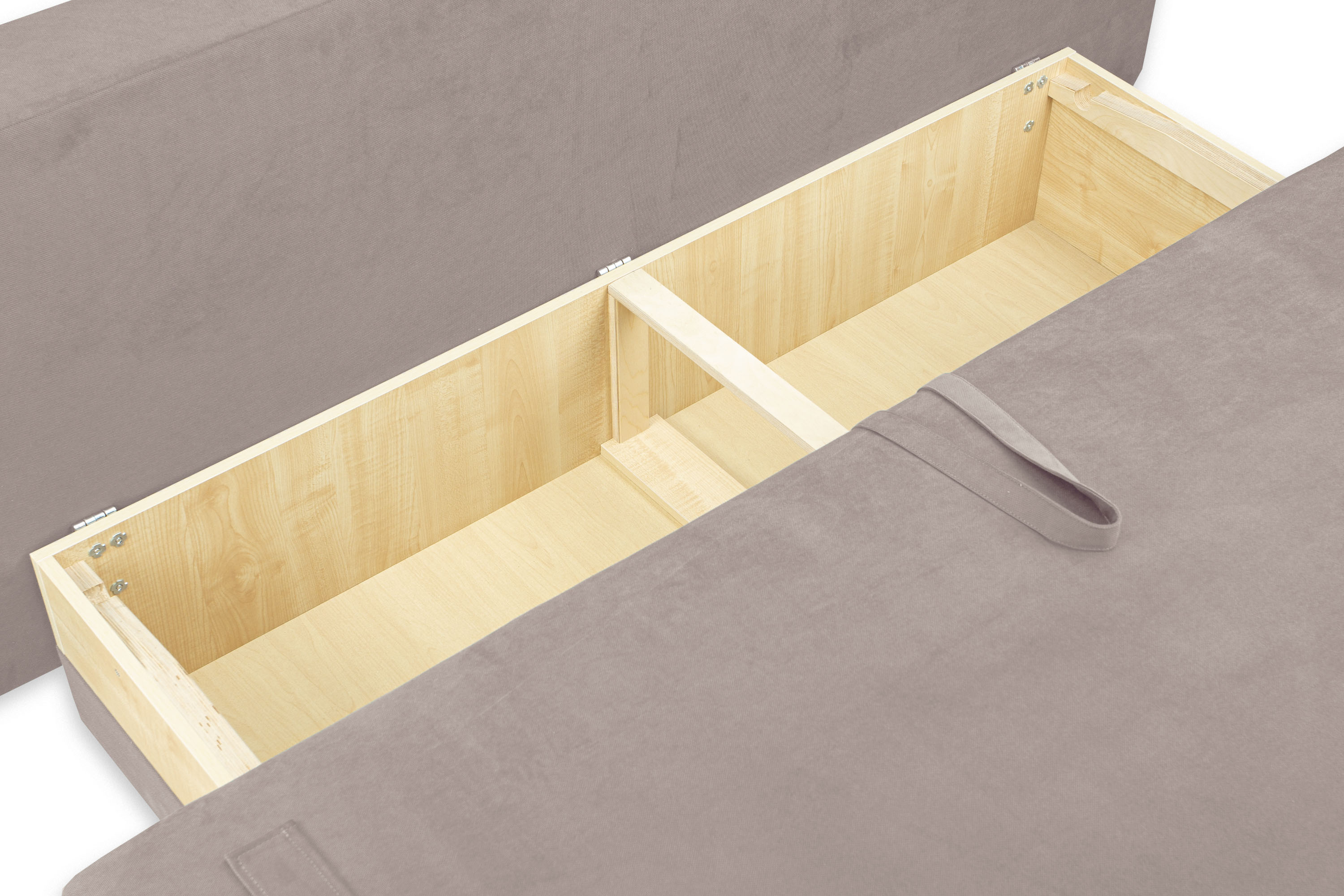 Под сиденьем расположен вместительный ящик для хранения. Видимая часть ящика обита тканью.