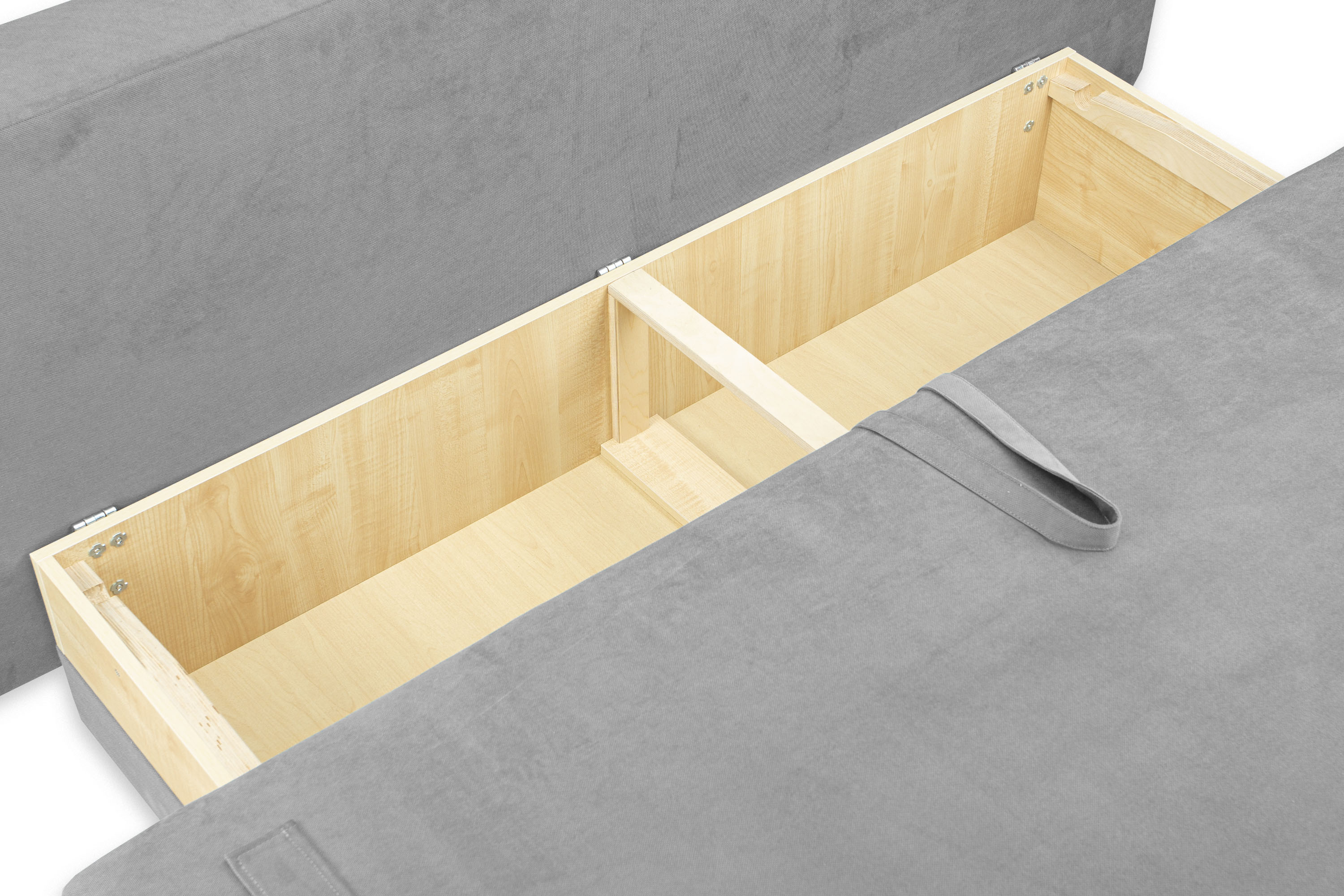 Под сиденьем расположен вместительный ящик для хранения. Видимая часть ящика обита тканью.