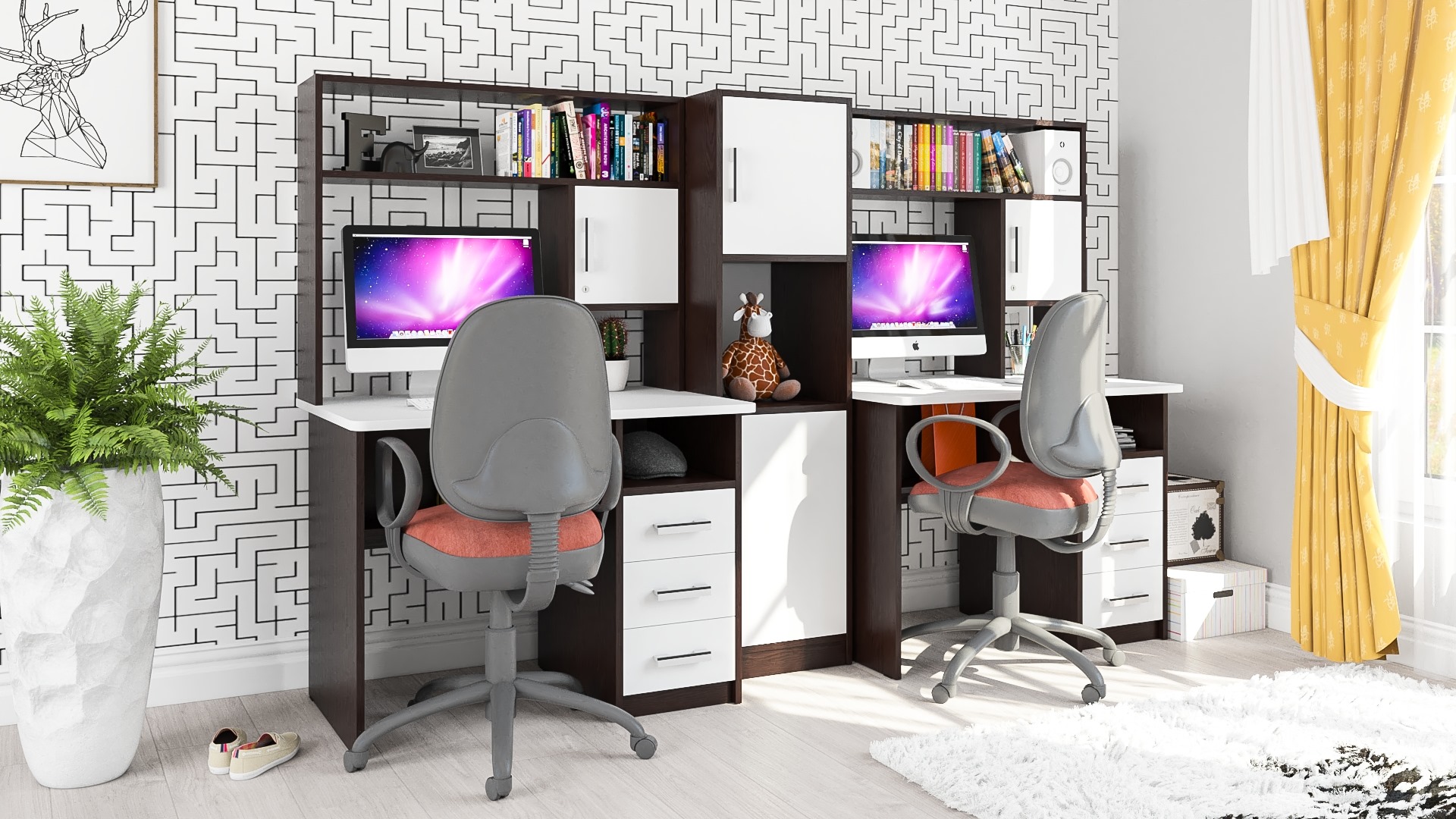 Каждый стол выполнен в классическом компактном варианте, оснащен удобной столешницей, надстройкой с нишей для монитора и тумбой с ящиками. Вместительная столешница легко разместит ноутбук или монитор с клавиатурой, оставляя достаточно места для учебных пособий и канцелярии. Под столешницей расположены две открытые ниши, которые предоставляют удобный доступ к самым важным предметам и место для системного блока. Столы не имеют универсальной сборки - справа у столов расположена тумба с тремя вместительными выдвижными ящиками, для хранения книг, канцелярии и деловых бумаг. Надстройка каждого стола с нишей под монитор диагональю до 27 дюймов (размер ниши 65х70х57 см) обеспечивает безопасность техники и организацию пространства для комфортной работы. Верхняя полка и боковые ниши надстройки отлично подходят для хранения справочников, учебников и других необходимых вещей.