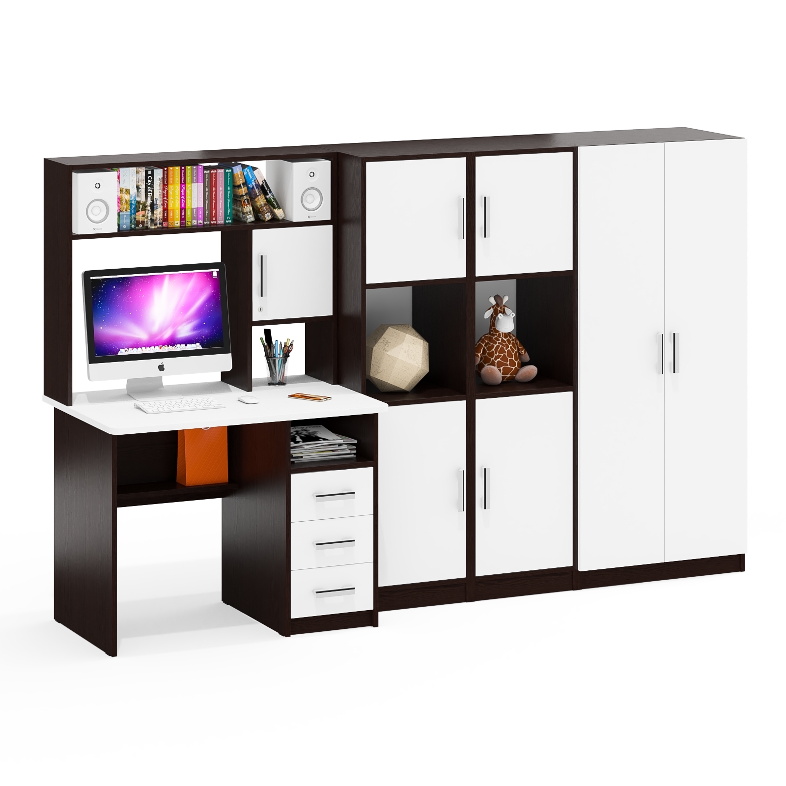 Все элементы мебели гармонично дополняют друг друга и составляют удобное рабочее место и вместительную систему хранения.
