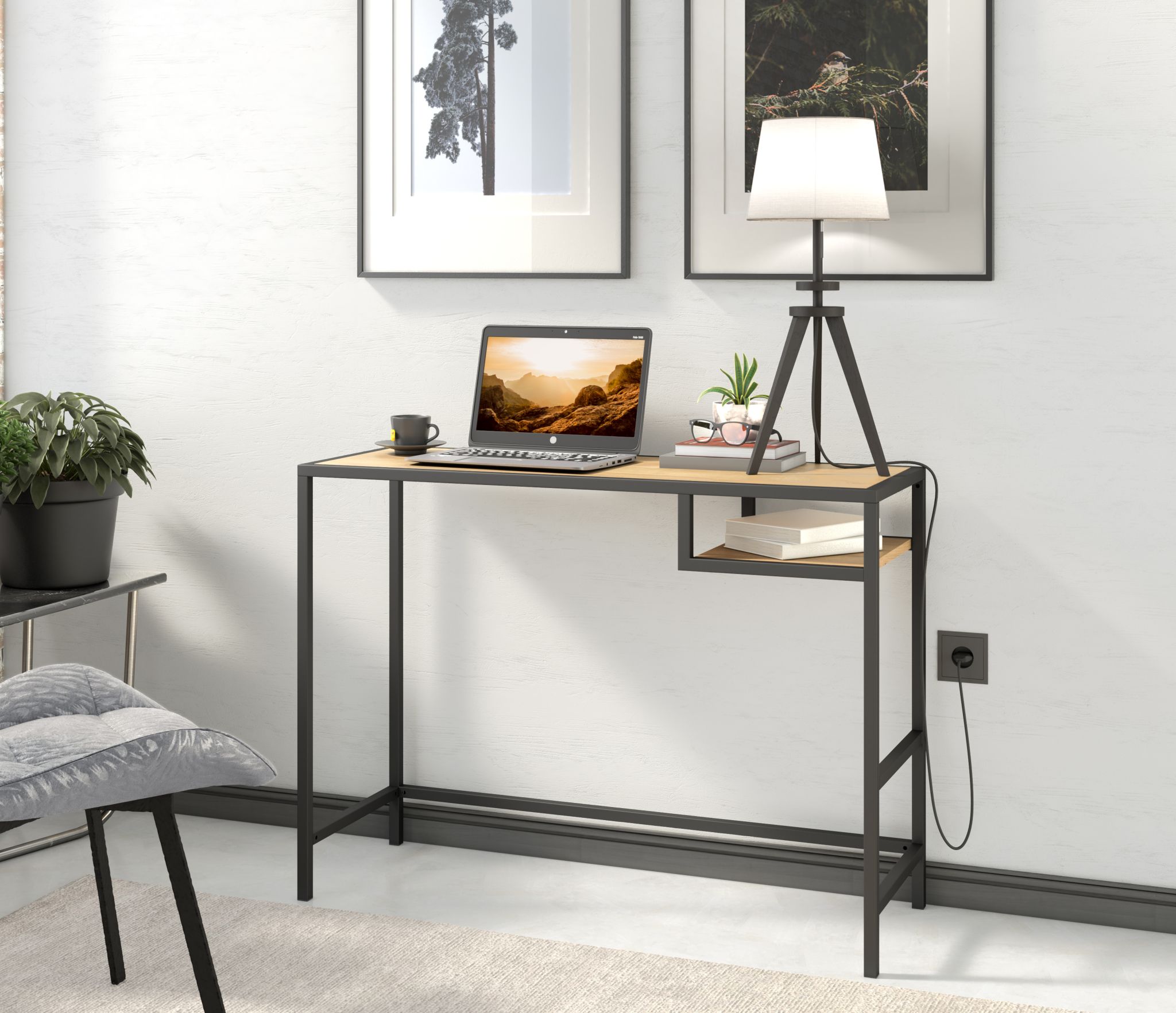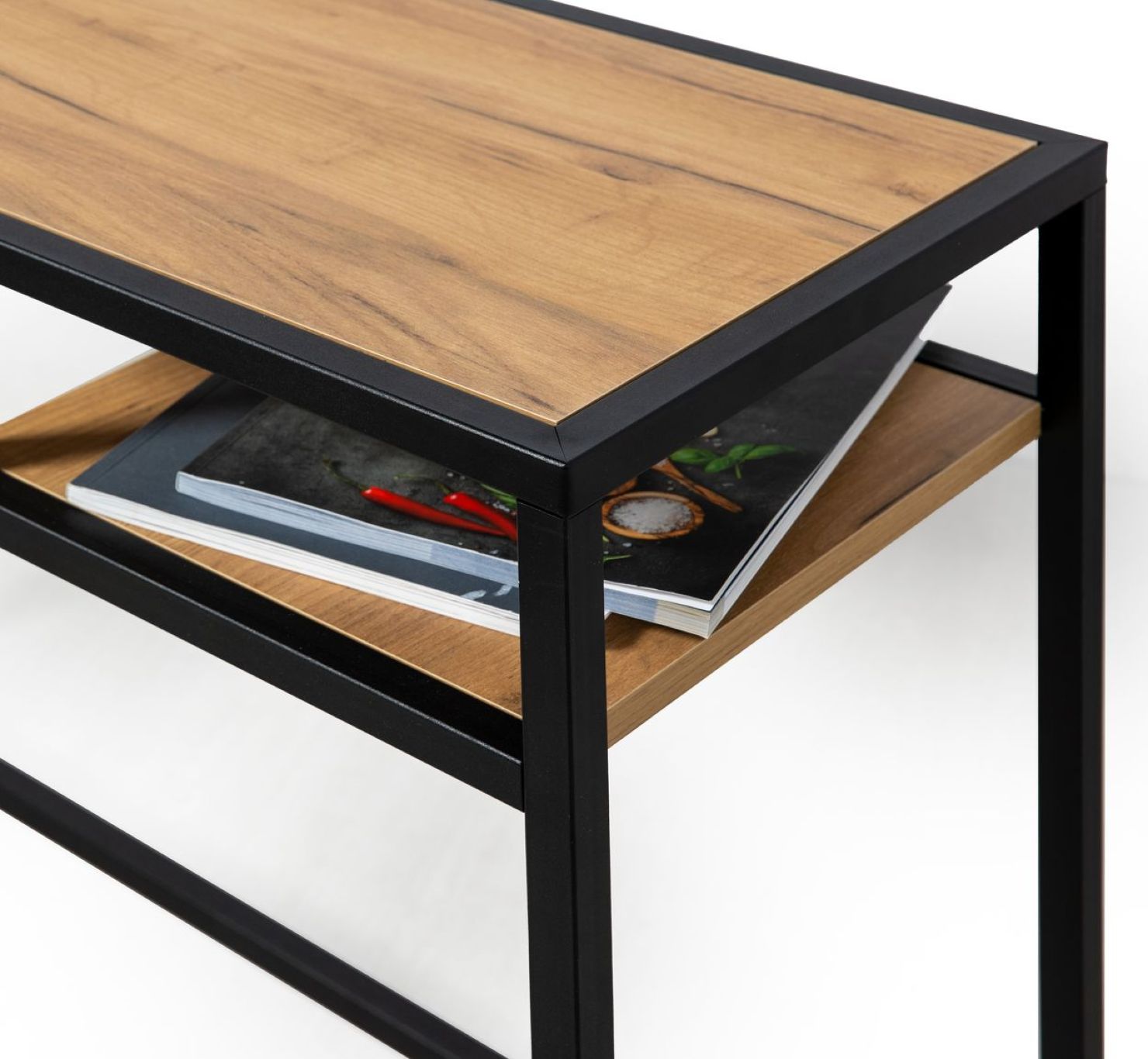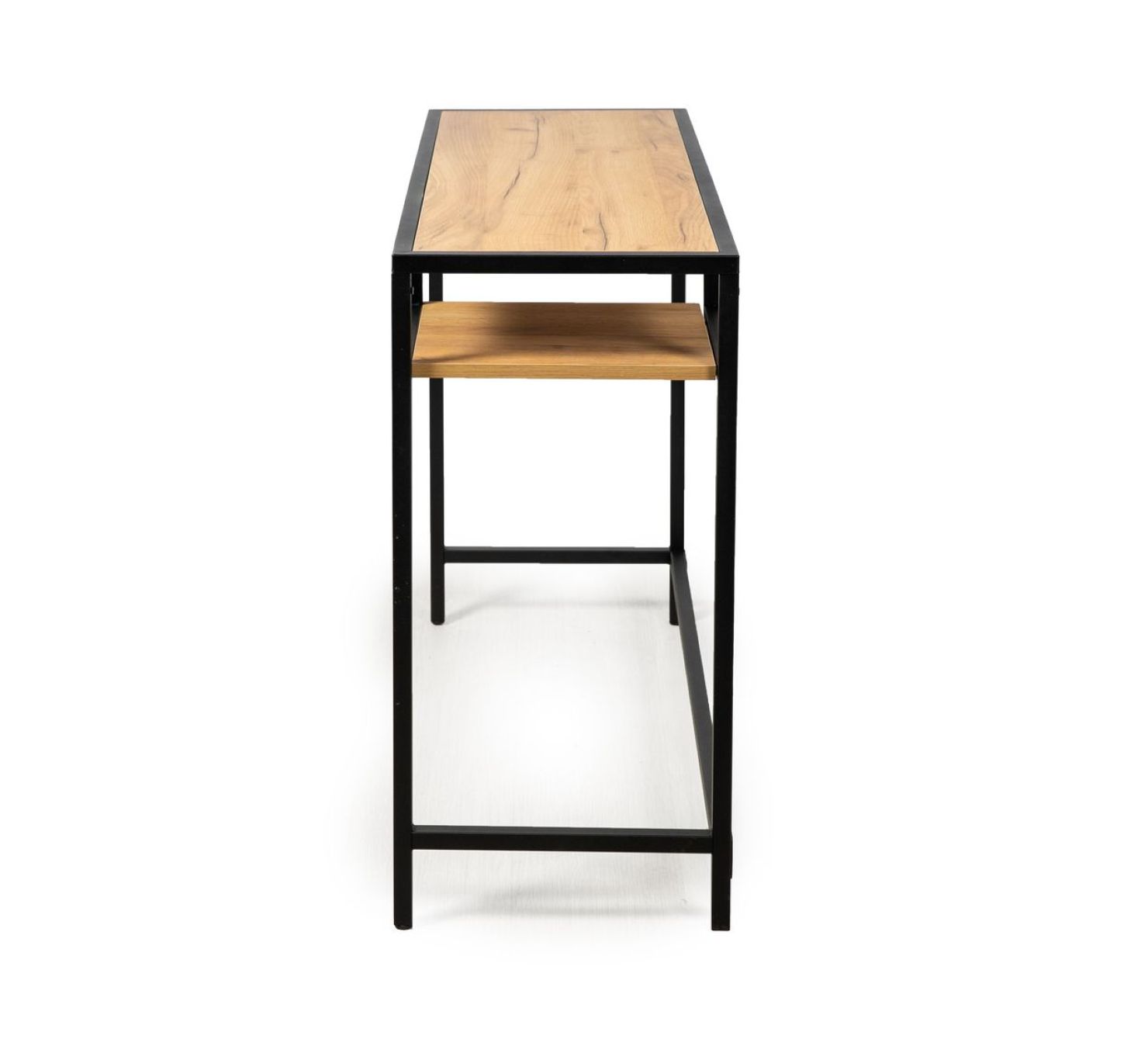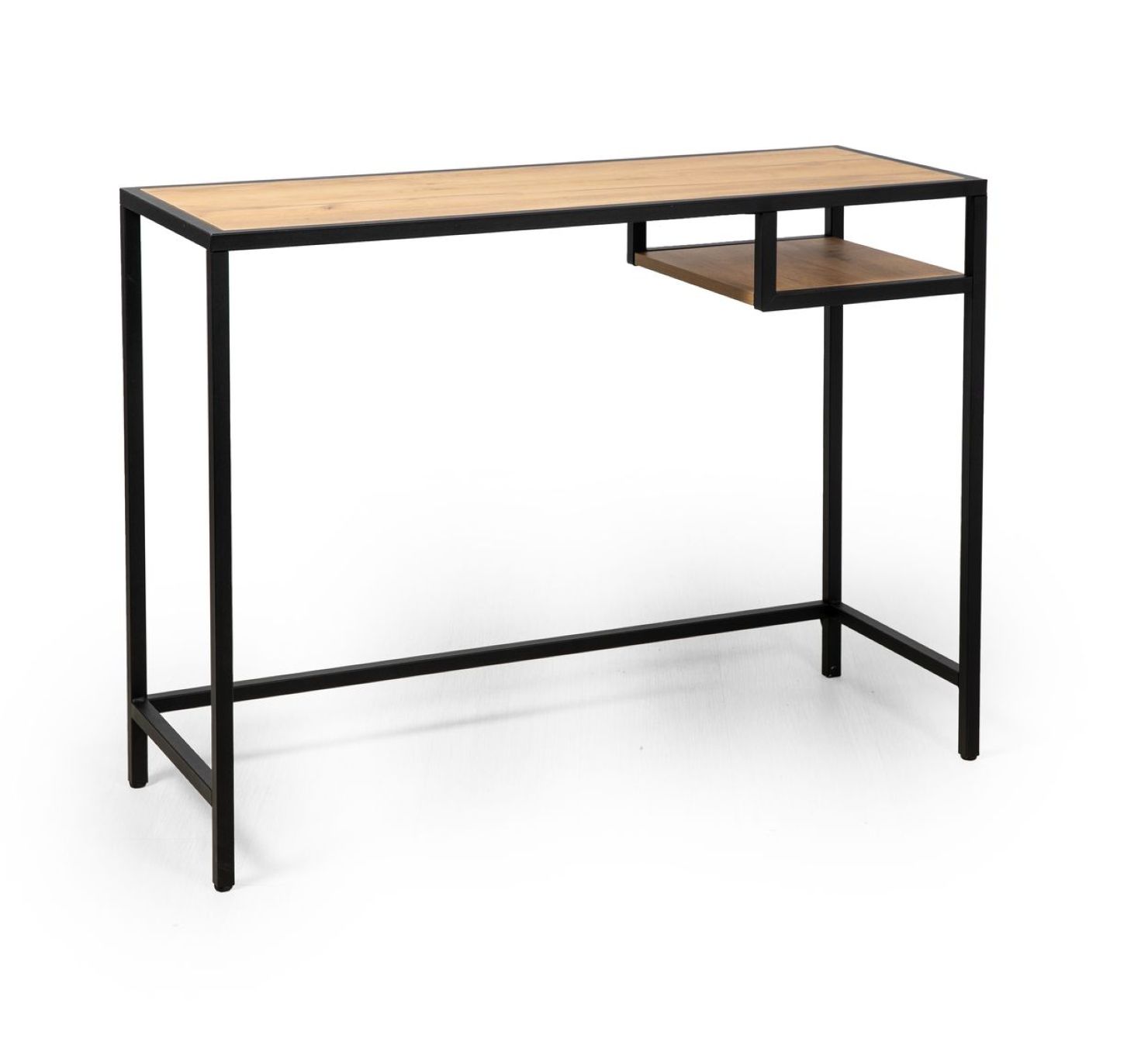 Конструкция с широкой столешницей и открытой полочкой для мелочей.