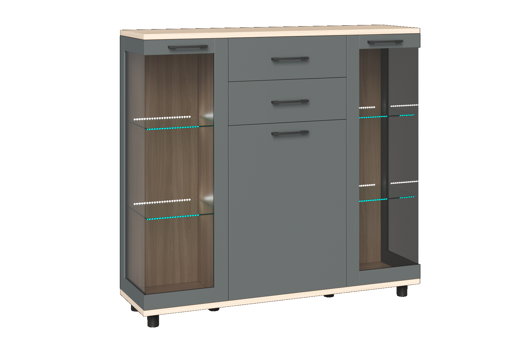 Интересная дизайнерская разработка со стеклянным фасадом и стеклянной боковой стенкой у витрин и антресольных секций стильно выделит интерьер уникальной композицией, а также позволит создавать уникальные буфетные варианты.