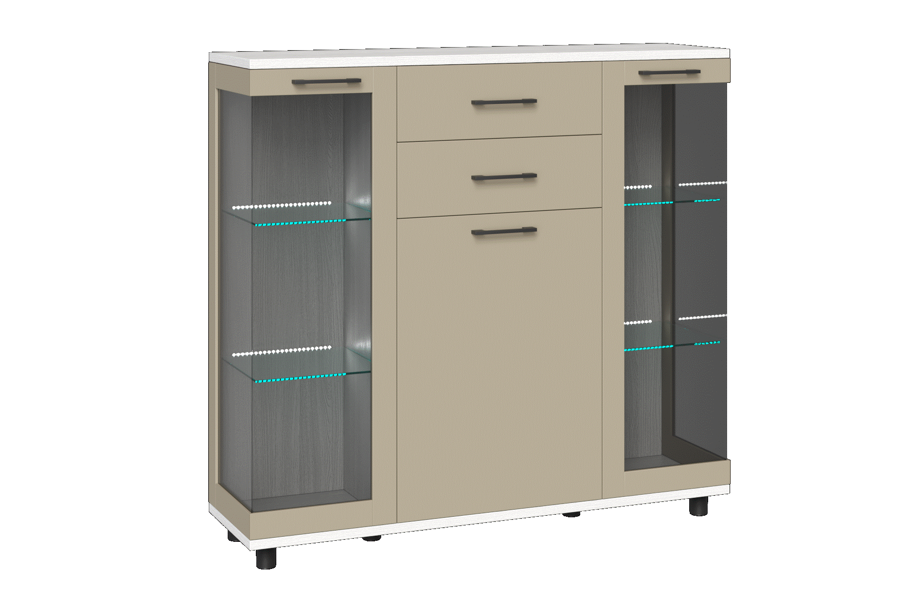 Интересная дизайнерская разработка со стеклянным фасадом и стеклянной боковой стенкой у витрин и антресольных секций стильно выделит интерьер уникальной композицией, а также позволит создавать уникальные буфетные варианты.