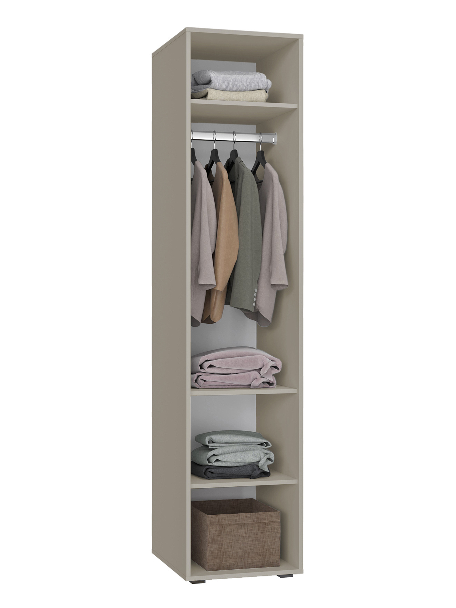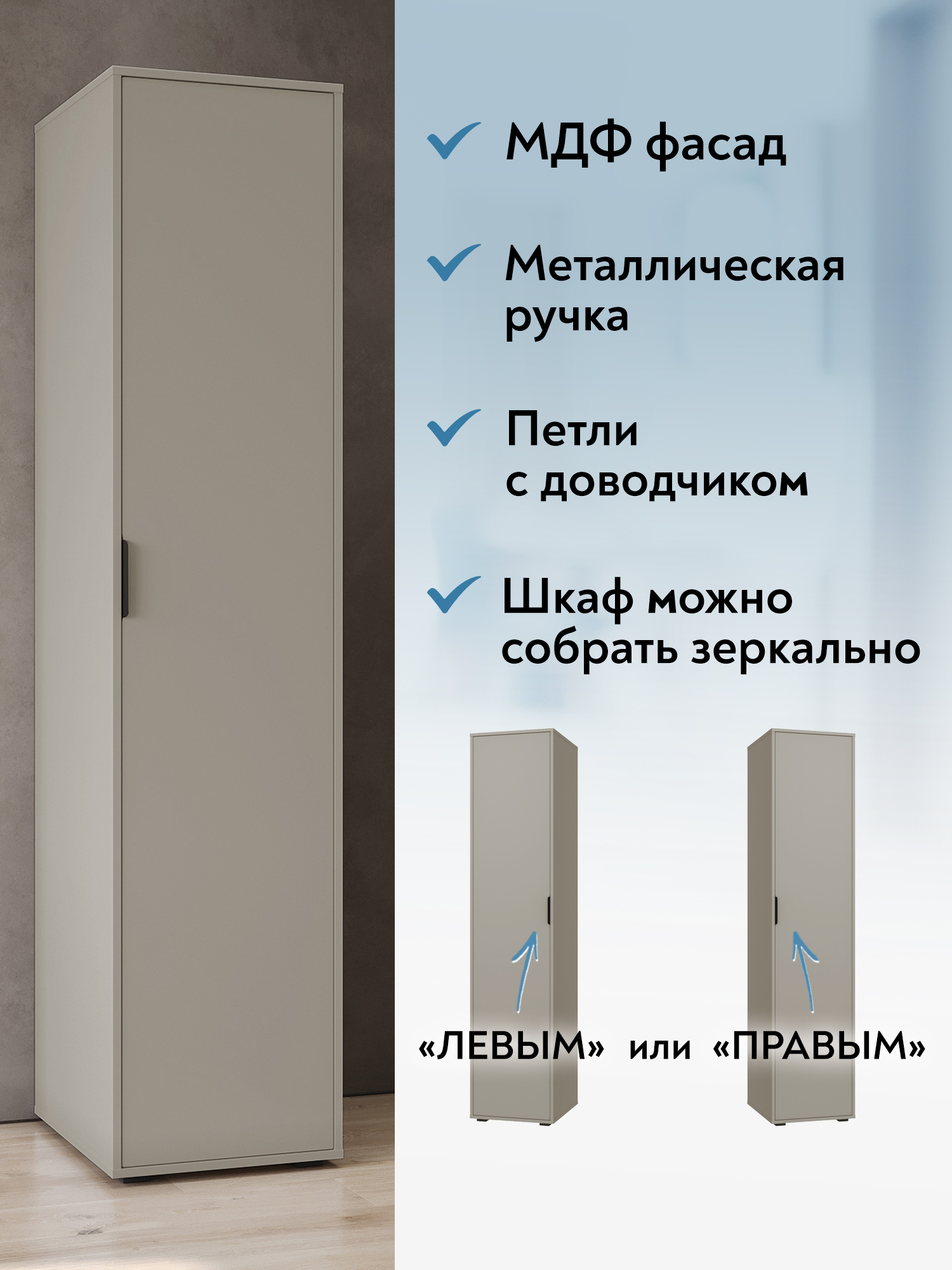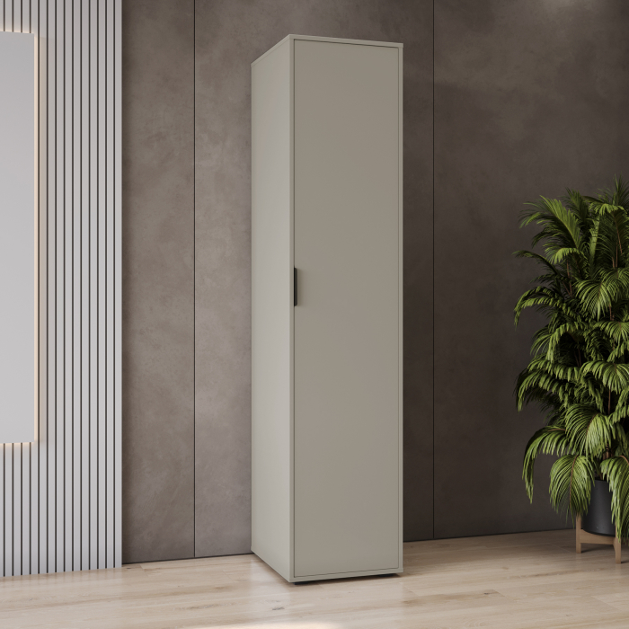 Пенал Оптима ОП-02 станет замечательным дополнением для обустройства комфортной и функциональной комнаты. За распашной дверью находятся штанга для вешалок-плечиков и три полки. Полки предназначены для хранения сложенной одежды, белья, различных аксессуаров и коробок с обувью. Модуль может быть собран "левым" или "правым". Высота опоры 20 мм. Фурнитура: петли с доводчиками, ручка металл, опоры регулируемые.
