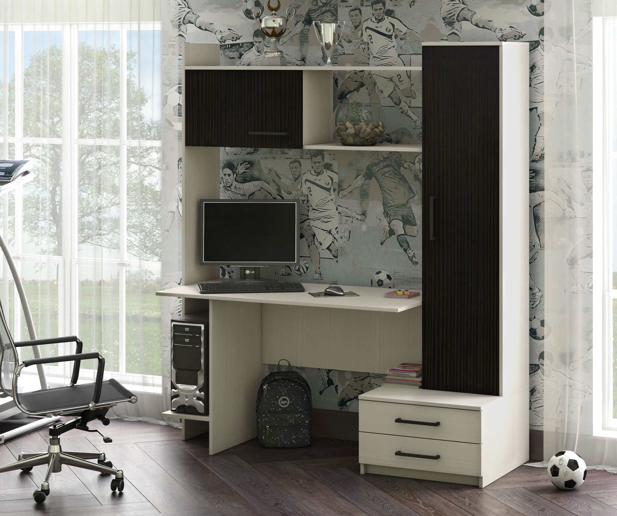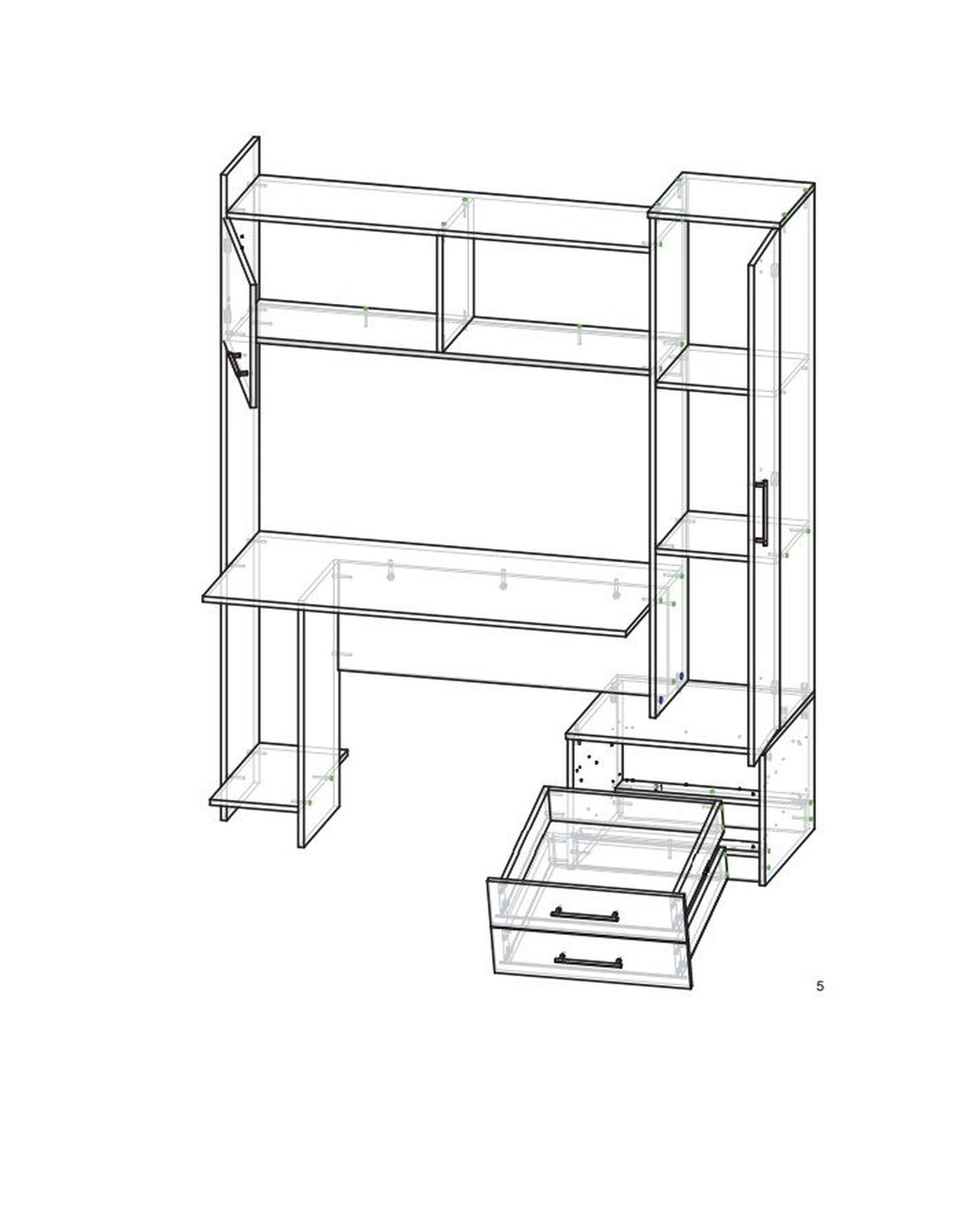 Интел-16 - современный компьютерный стол с надстройкой, полкой под системный блок и пеналом. На открытых и закрытых полках надстройки можно расположить необходимые мелочи или книги. Пенал имеет закрытые распашной дверцей полки и-два широких выдвижных ящика.