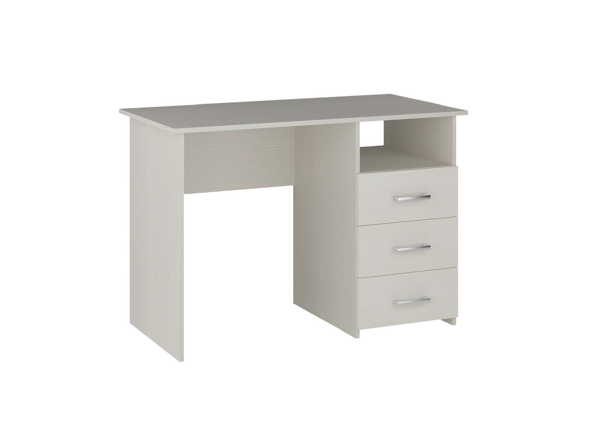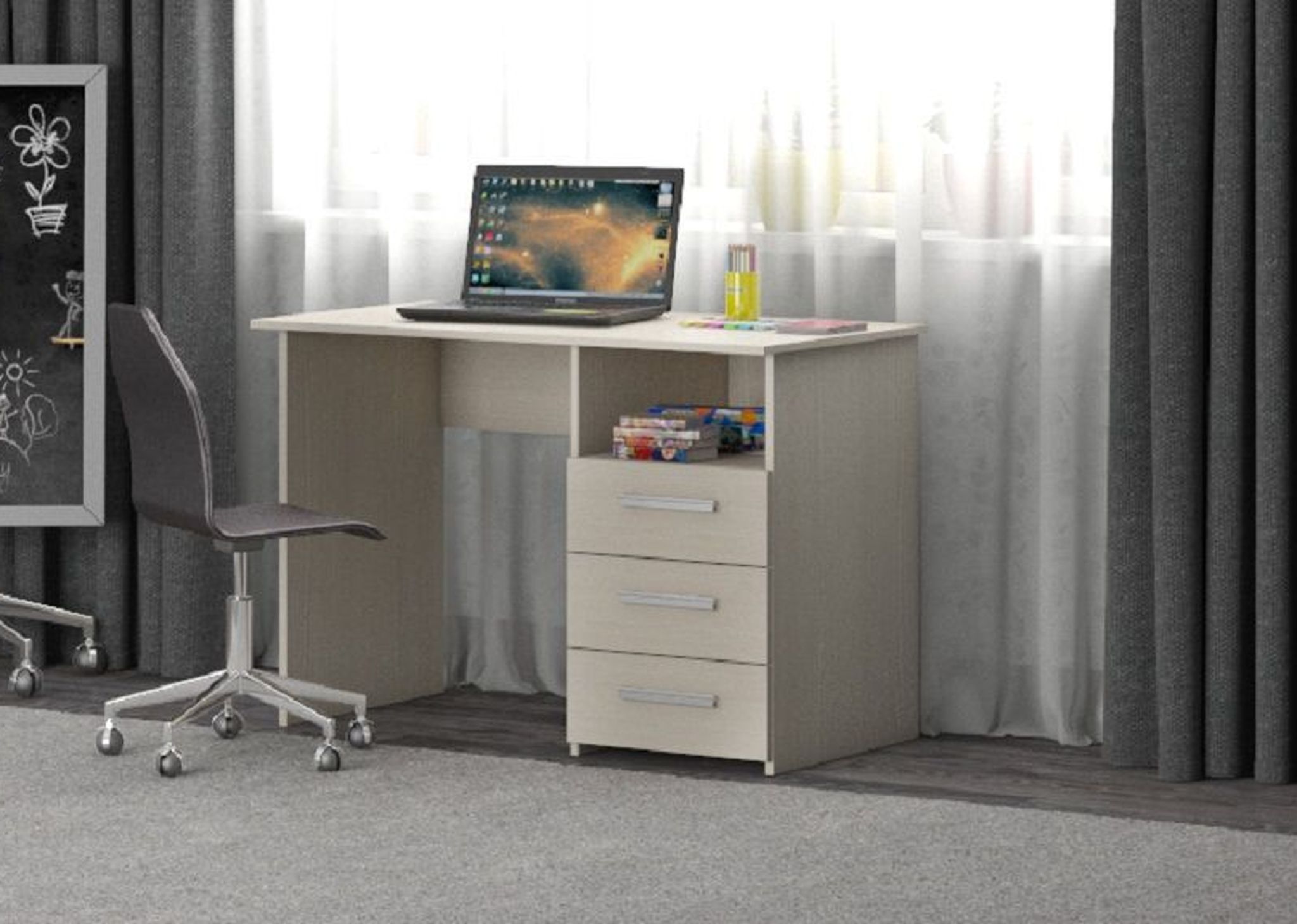 Интел-3 стол письменный имеет широкую столешницу, тумбу с ящиками и открытую нишу. Главным отличием от компьютерного стола является отсутствие подстолья и полки под клавиатуру.