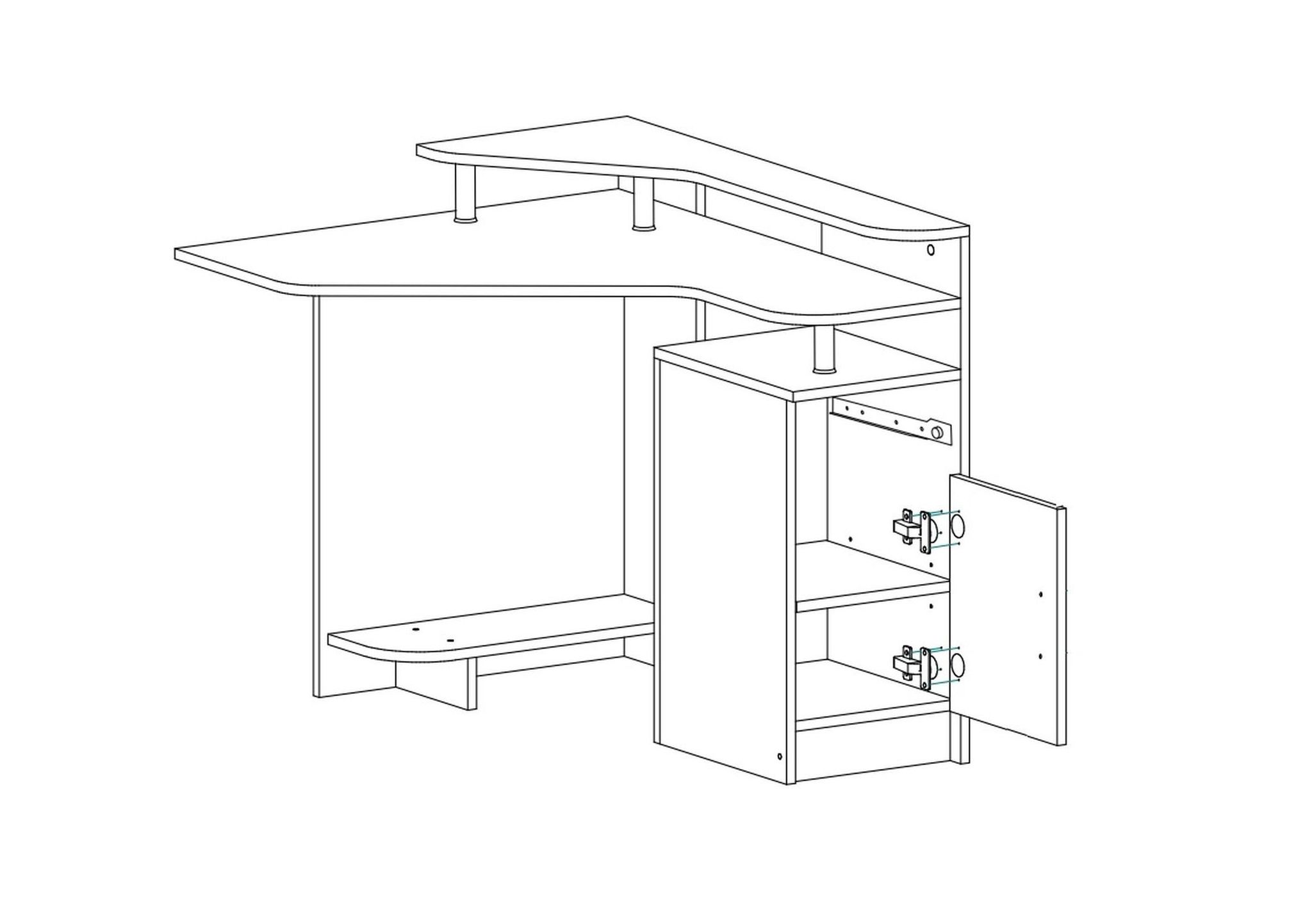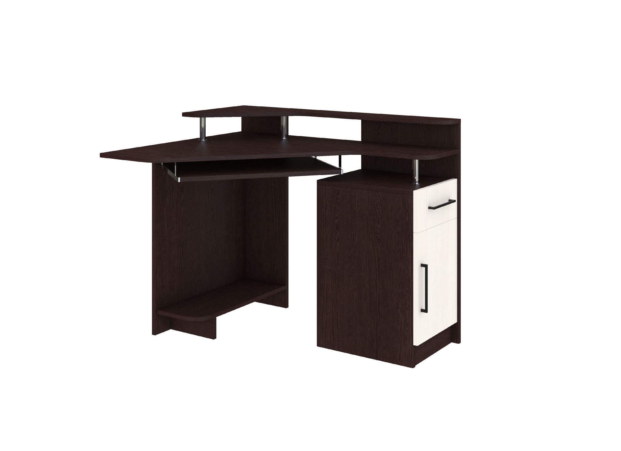 Угловой компьютерный стол Интел-5 для домашнего использования и офиса. Стол оборудован небольшой надстройкой под монитор, выдвижной полкой под клавиатуру, полкой под системный блок и тумбой с глухой дверкой и ящиком на роликовых направляющих.