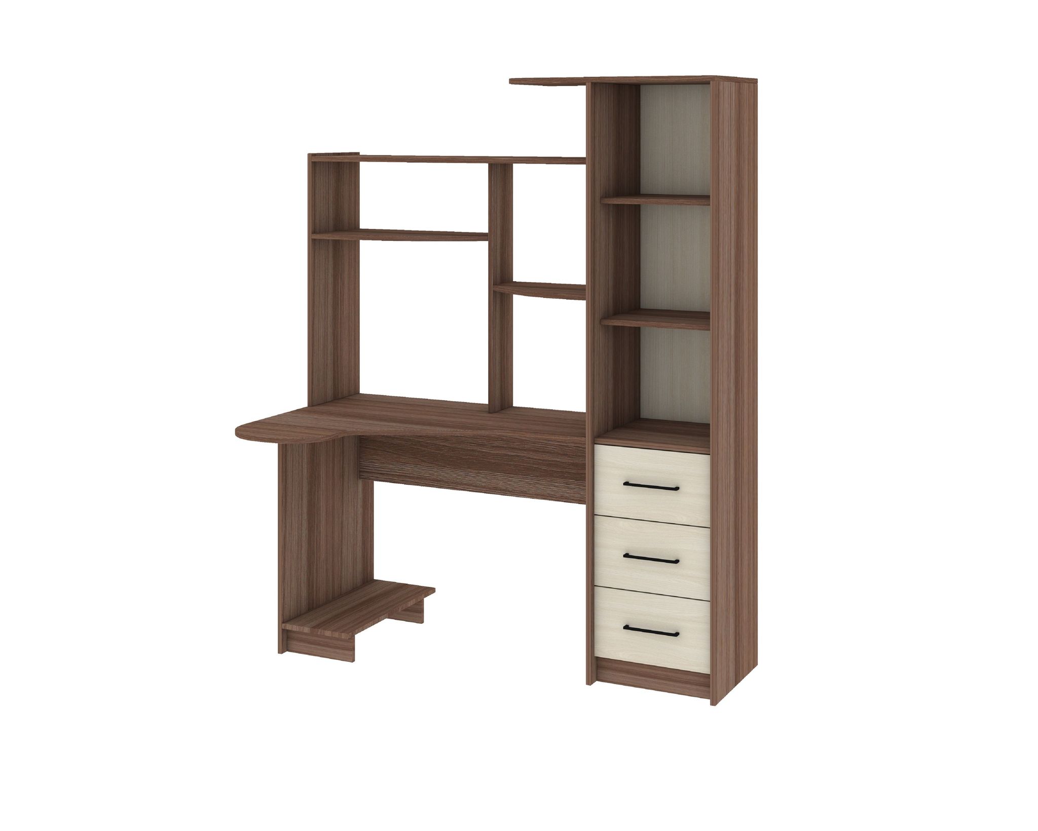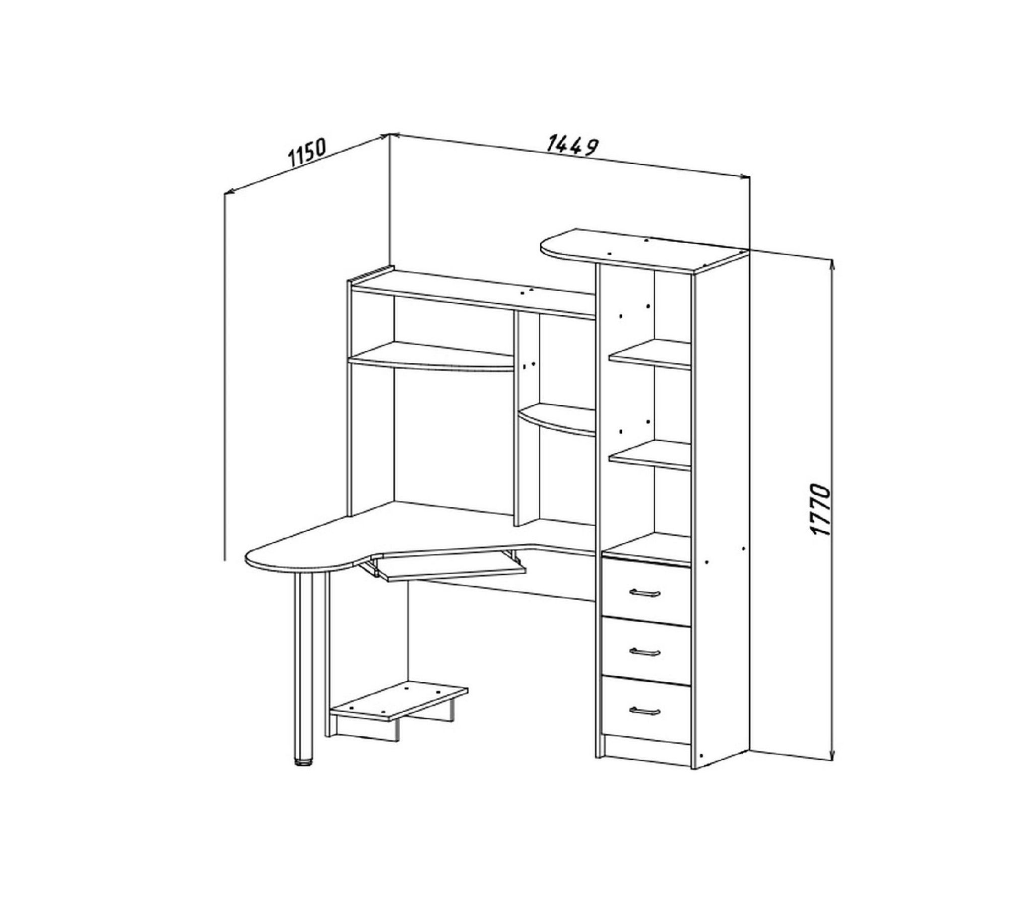 Интел-9 - эргономичный компьютерный стол с выдвижной полкой под клавиатуру, надстройкой, полкой под системный блок и пеналом. На открытых полках надстройки можно расположить необходимые мелочи или книги. Пенал имеет открытые полки и тумбу с 3-мя выдвижными ящиками.