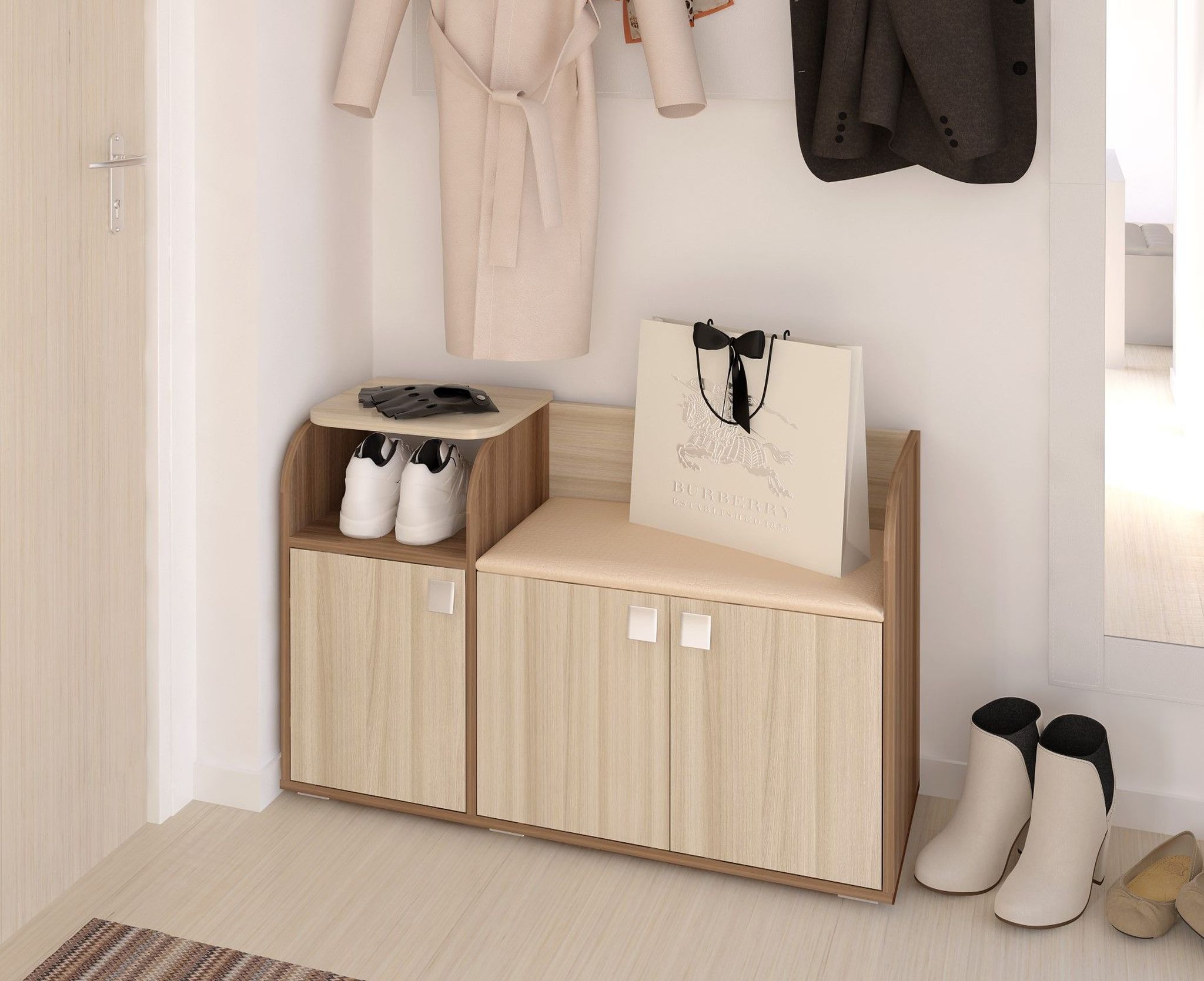 Тумба для обуви Ивушка 5 с мягким сидением, открытой нишей и полками за 3-мя распашными дверцами.