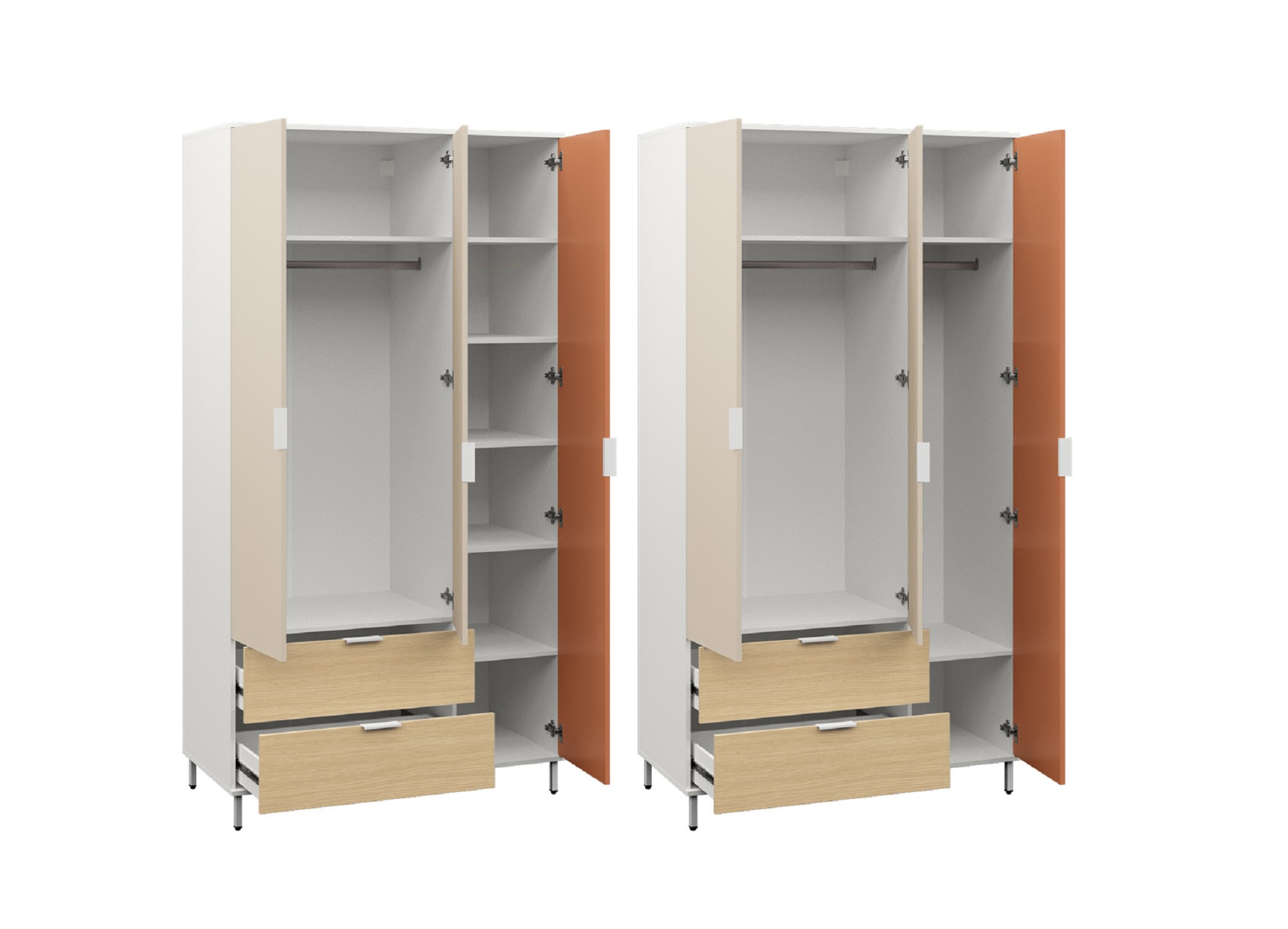 Внутри шкаф оборудован полками и штангами.
