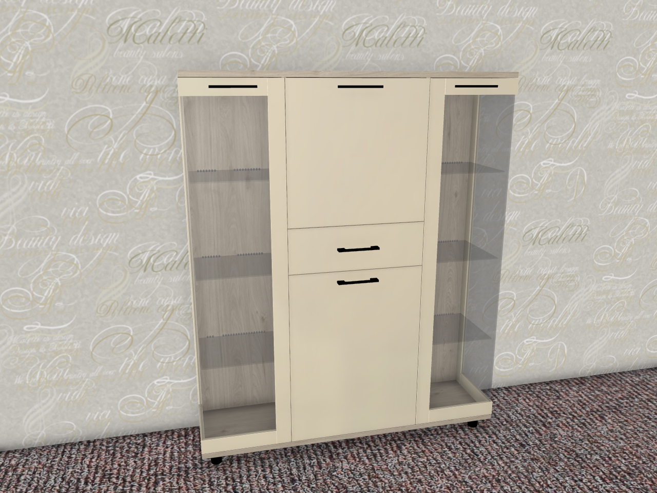 Интересная дизайнерская разработка со стеклянным фасадом и стеклянной боковой стенкой у витрин и антресольных секций стильно выделит интерьер уникальной композицией, а также позволит создавать уникальные буфетные варианты.