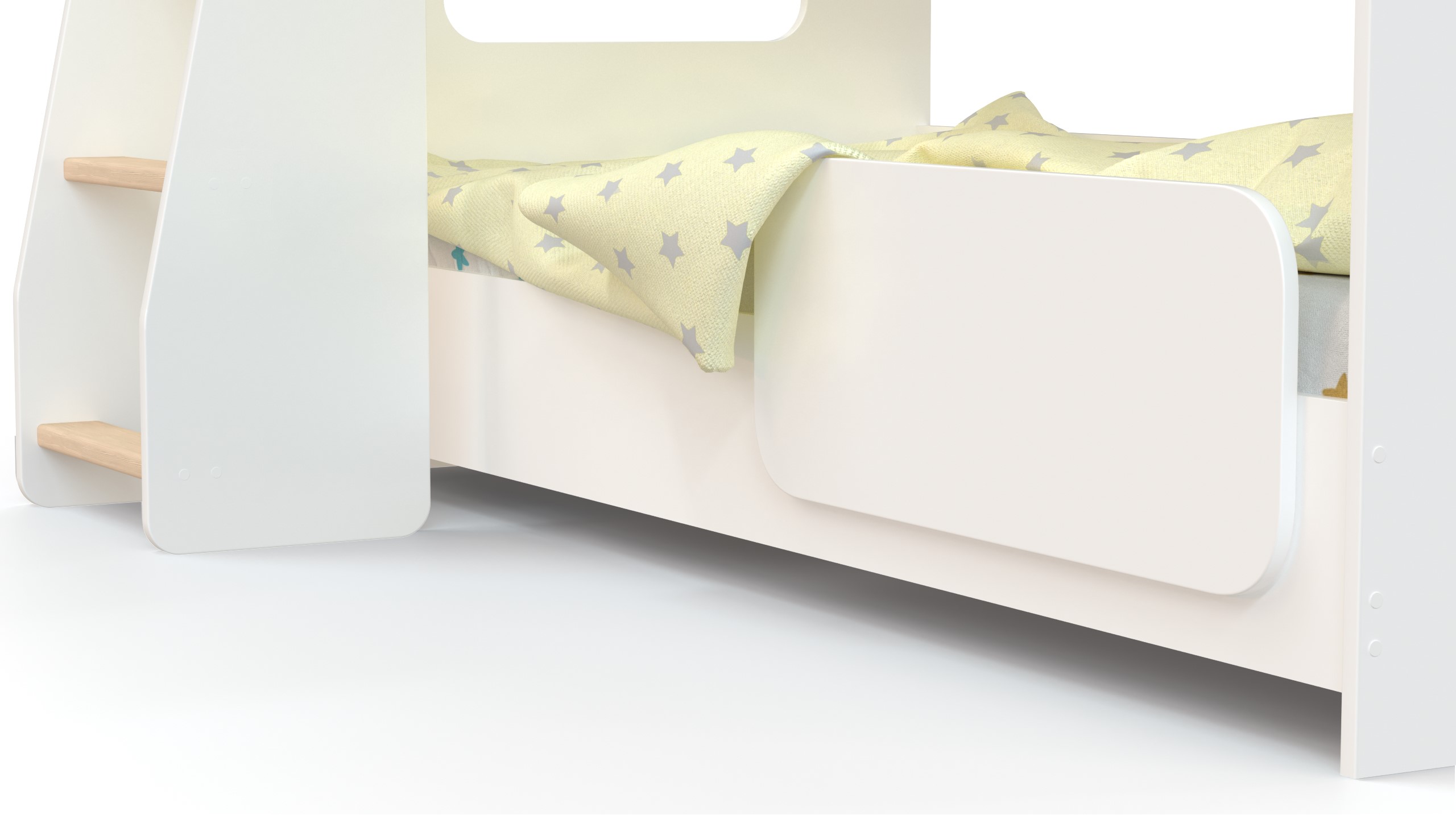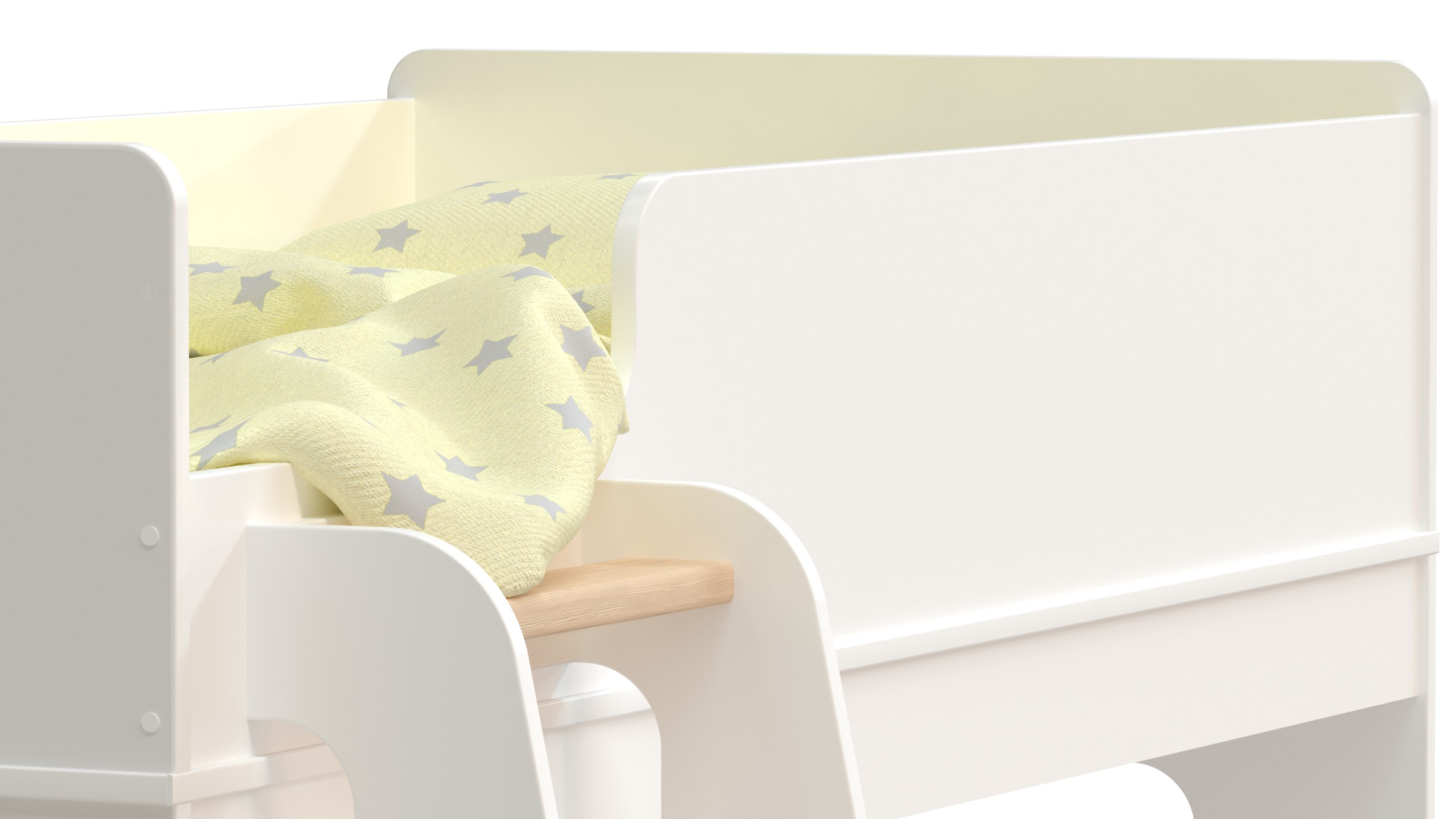 Нижний ярус расположен на высоте всего 230 мм от пола, что позволяет очень маленькому ребенку комфортно забираться и слезать с кроватки.