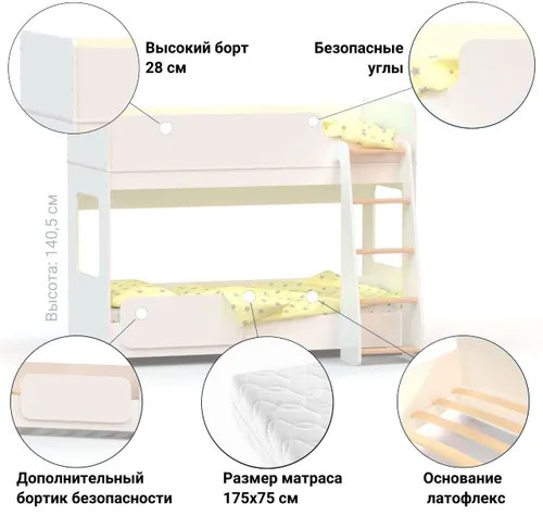 От пола до основания верхнего спального места 108 см, что позволит родителям не переживать за малыша, а ребенку будет не страшно забираться на кровать и спать. Удобно заправлять кровать, не забираясь на верхний ярус.